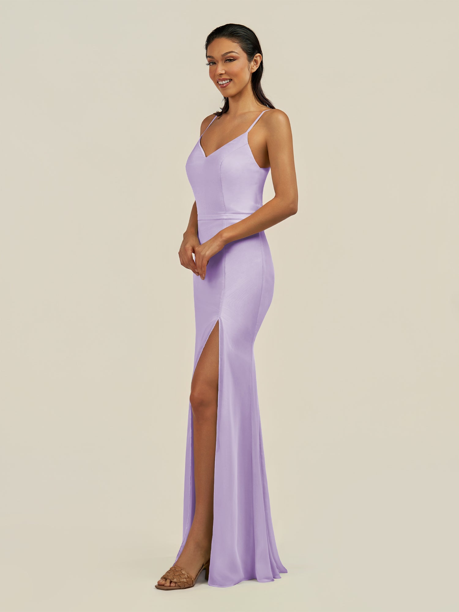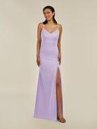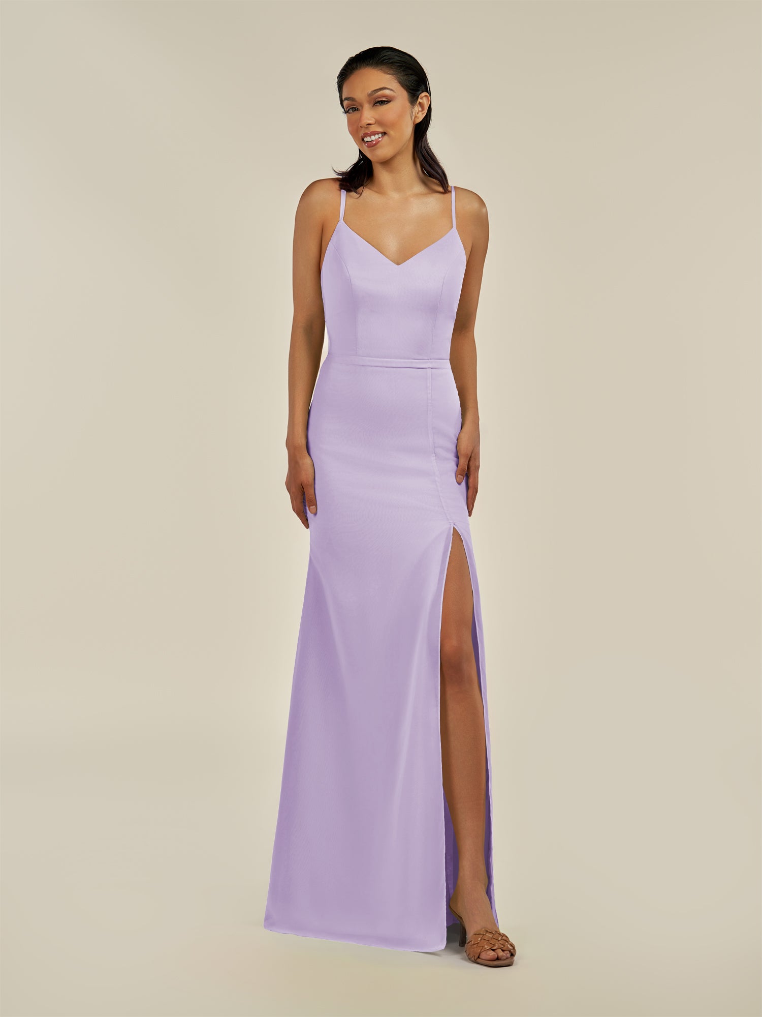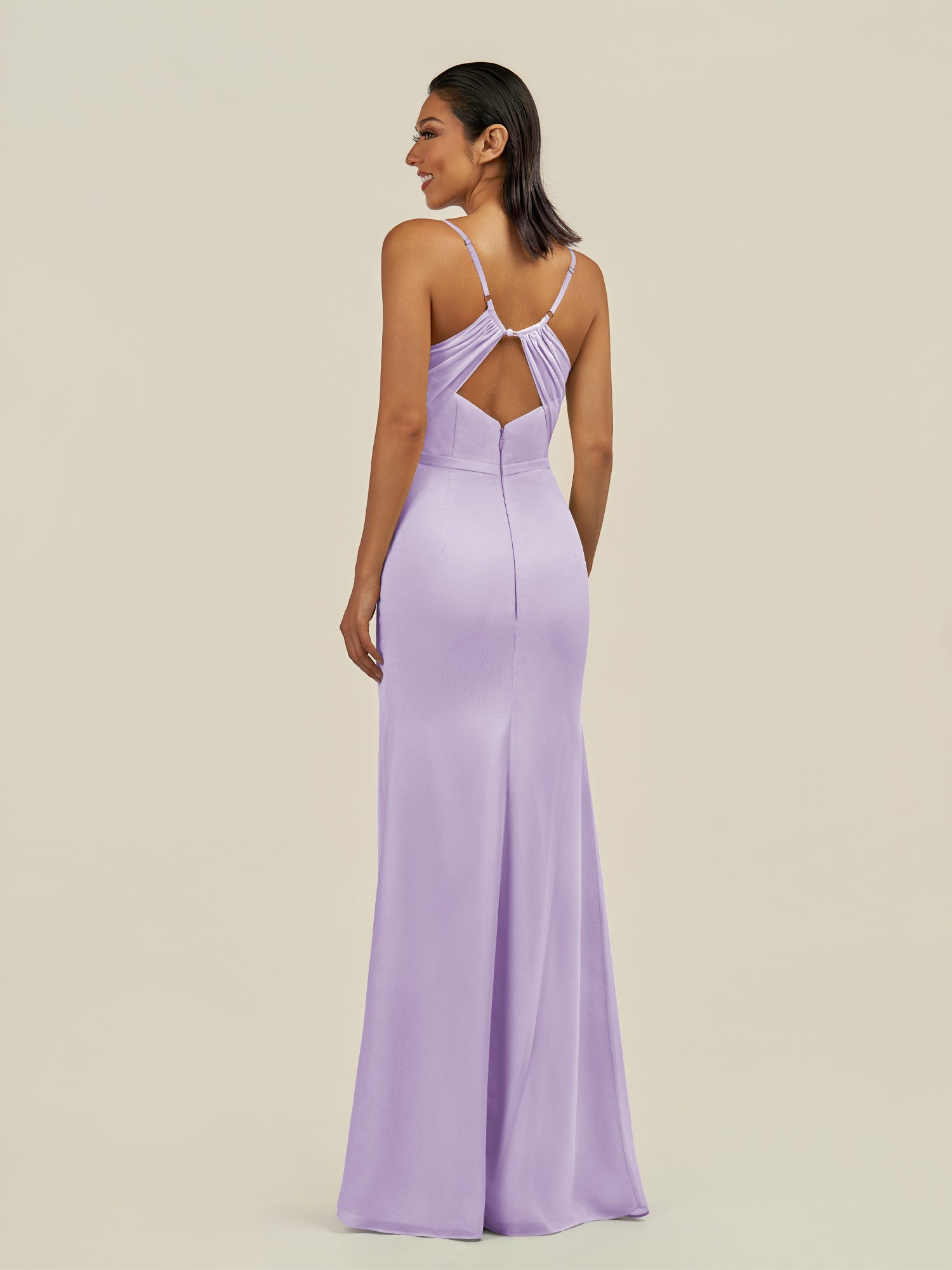 Kaelin is a sleek and elegant choice for your bridal party. Crafted from soft chiffon, she features a flattering V-neckline and a sleeveless bodice that highlights the shoulders with grace. Her floor-length sheath silhouette flows smoothly, enhanced by a subtle side slit for movement and modern sophistication. Finished with a smooth zipper back, Kaelin blends timeless style with contemporary elegance—perfect for weddings and special occasions.