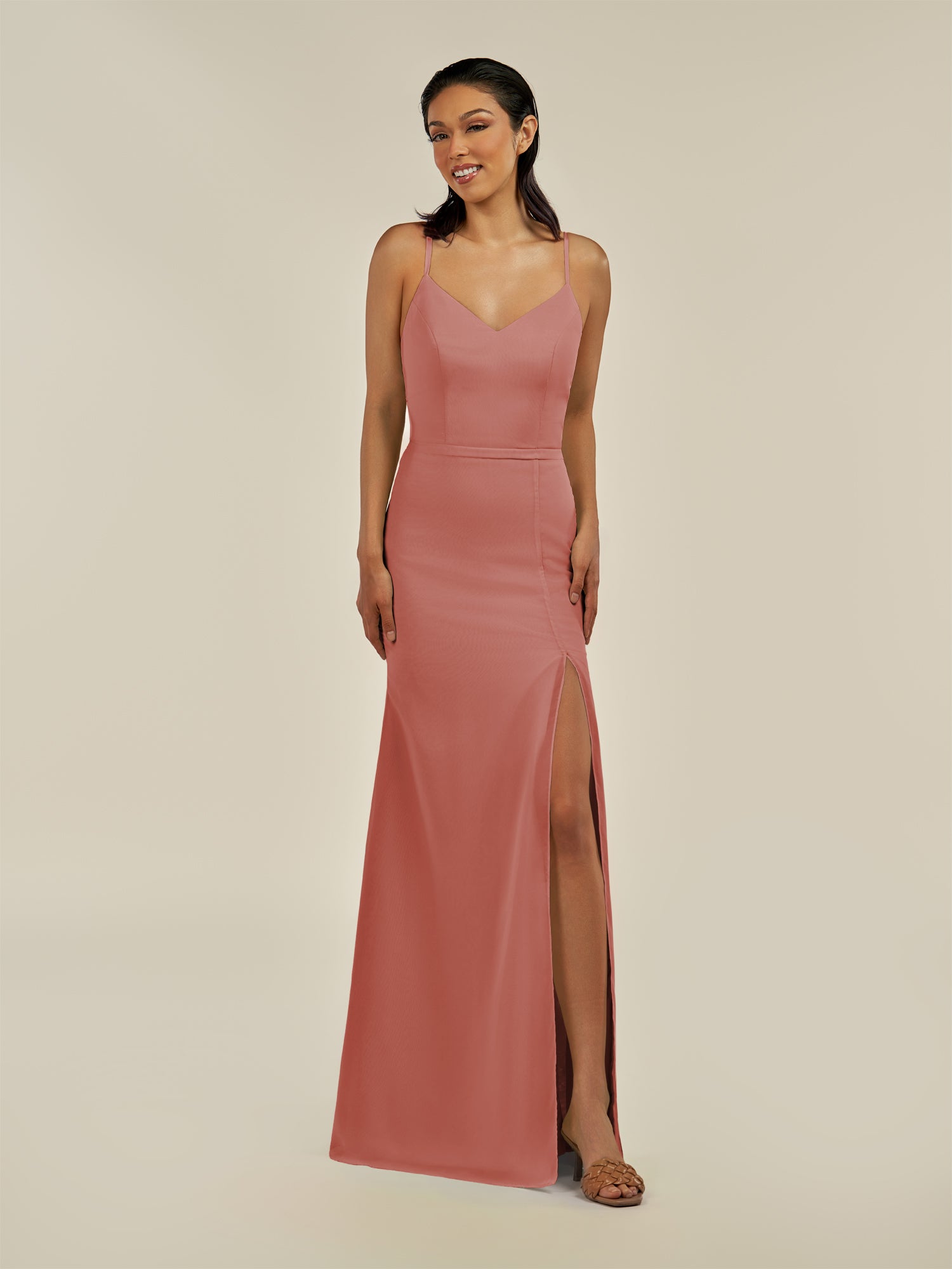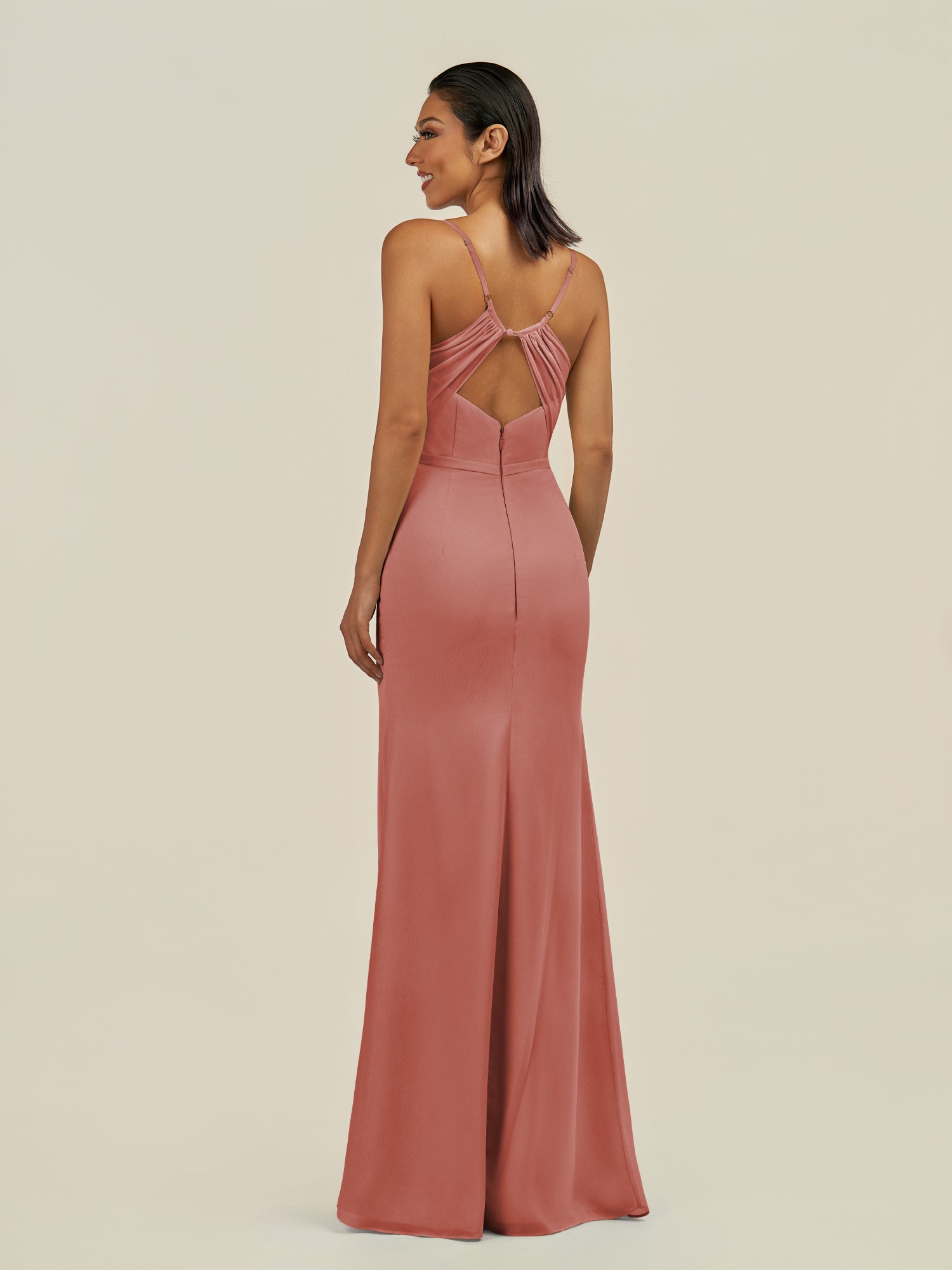 Kaelin is a sleek and elegant choice for your bridal party. Crafted from soft chiffon, she features a flattering V-neckline and a sleeveless bodice that highlights the shoulders with grace. Her floor-length sheath silhouette flows smoothly, enhanced by a subtle side slit for movement and modern sophistication. Finished with a smooth zipper back, Kaelin blends timeless style with contemporary elegance—perfect for weddings and special occasions.