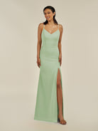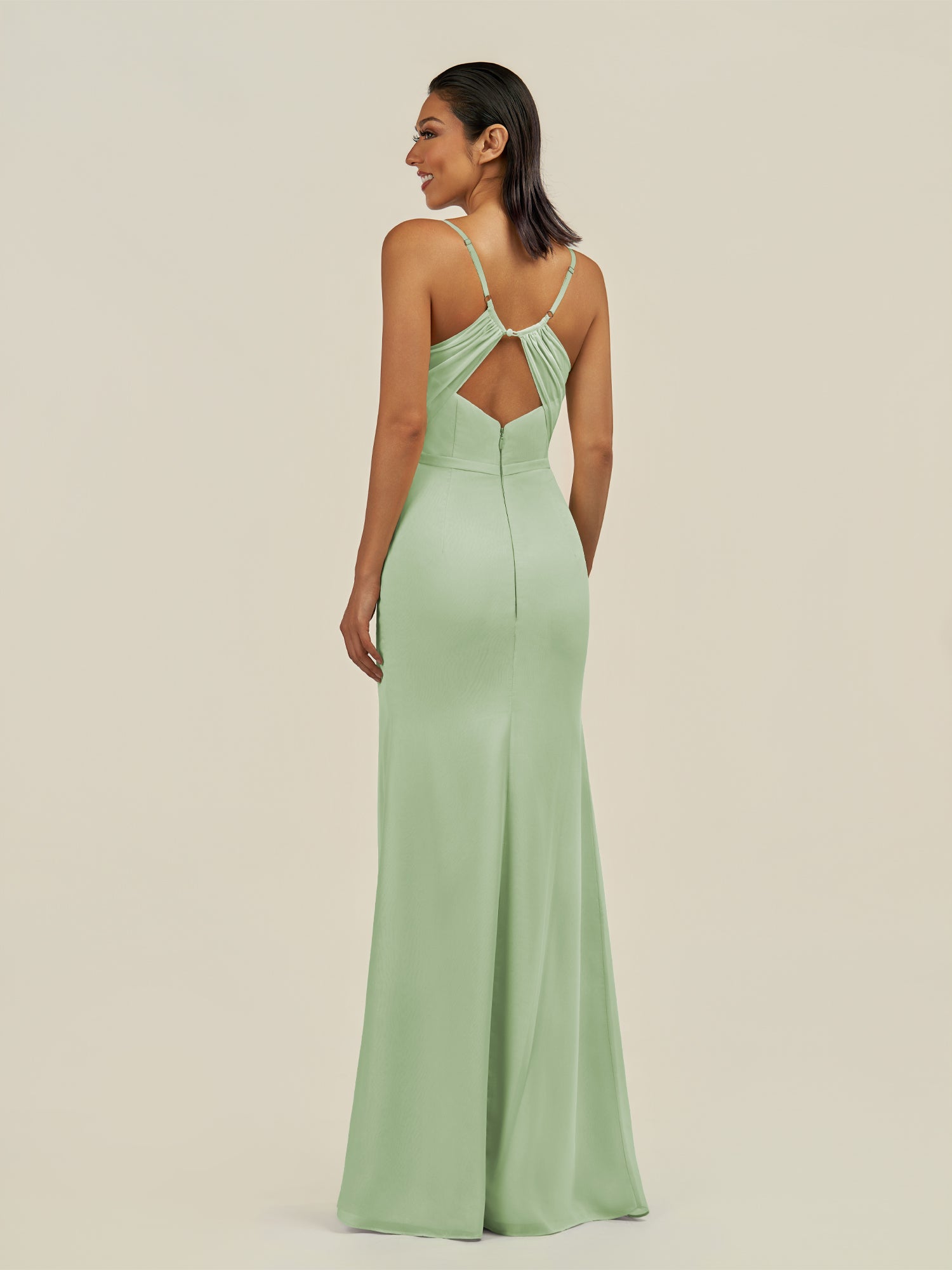 Kaelin is a sleek and elegant choice for your bridal party. Crafted from soft chiffon, she features a flattering V-neckline and a sleeveless bodice that highlights the shoulders with grace. Her floor-length sheath silhouette flows smoothly, enhanced by a subtle side slit for movement and modern sophistication. Finished with a smooth zipper back, Kaelin blends timeless style with contemporary elegance—perfect for weddings and special occasions.