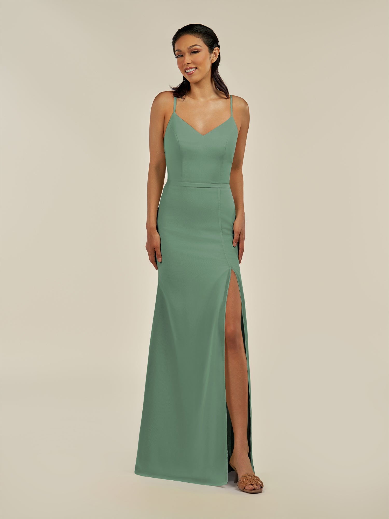 Kaelin is a sleek and elegant choice for your bridal party. Crafted from soft chiffon, she features a flattering V-neckline and a sleeveless bodice that highlights the shoulders with grace. Her floor-length sheath silhouette flows smoothly, enhanced by a subtle side slit for movement and modern sophistication. Finished with a smooth zipper back, Kaelin blends timeless style with contemporary elegance—perfect for weddings and special occasions.