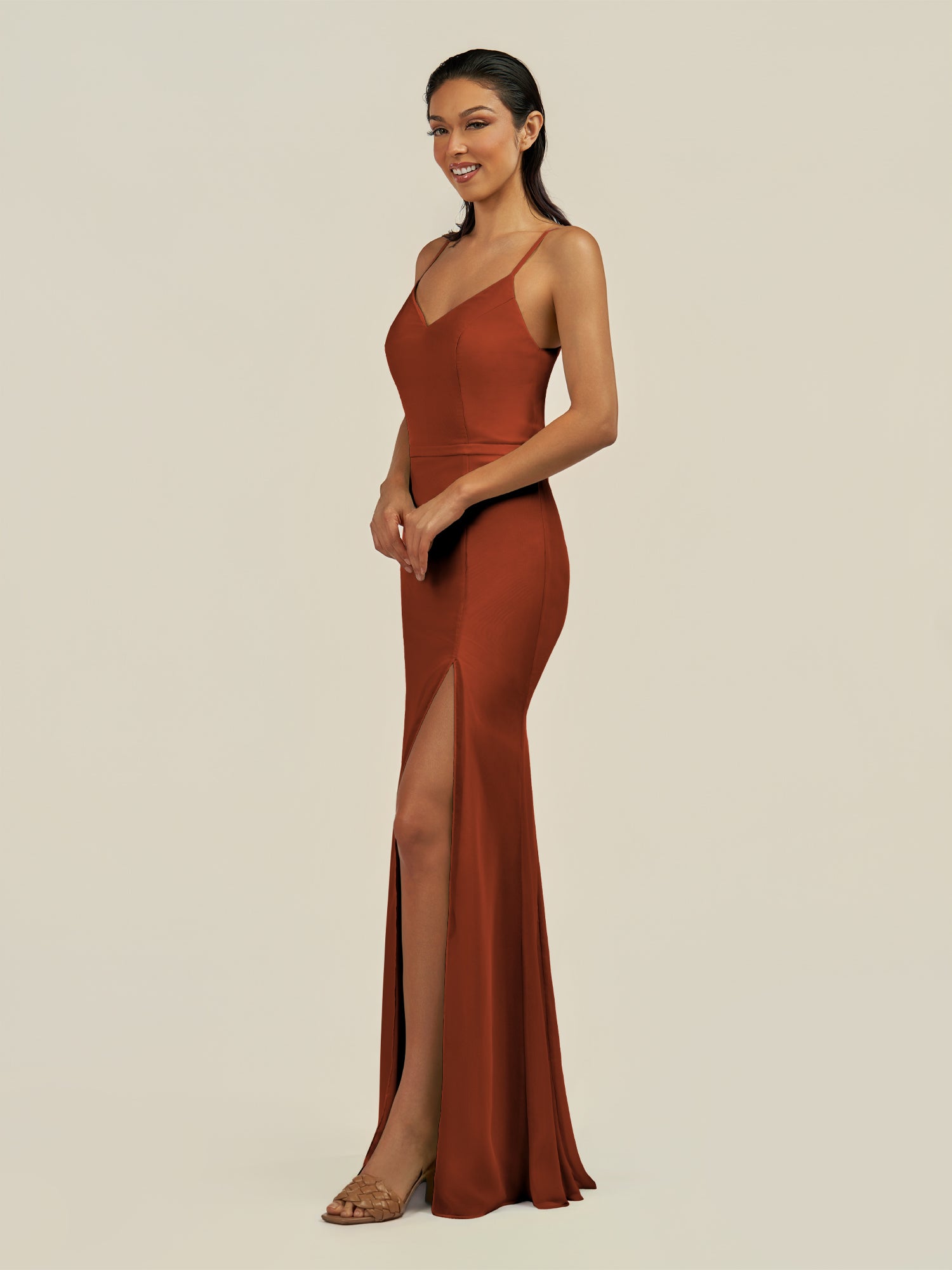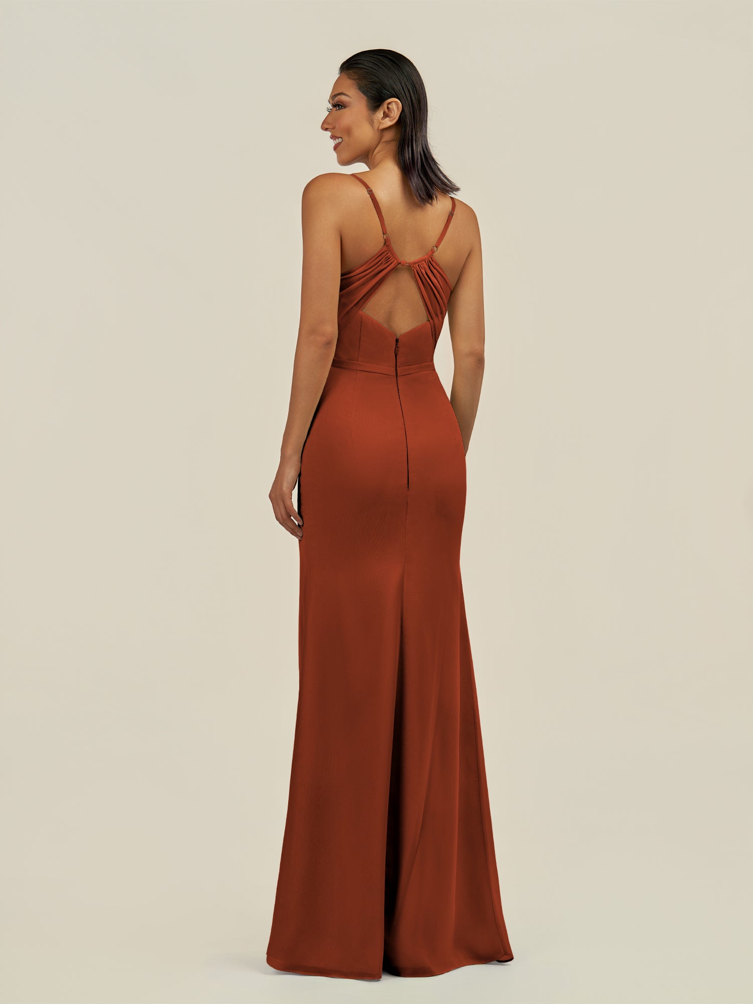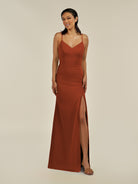 Kaelin is a sleek and elegant choice for your bridal party. Crafted from soft chiffon, she features a flattering V-neckline and a sleeveless bodice that highlights the shoulders with grace. Her floor-length sheath silhouette flows smoothly, enhanced by a subtle side slit for movement and modern sophistication. Finished with a smooth zipper back, Kaelin blends timeless style with contemporary elegance—perfect for weddings and special occasions.