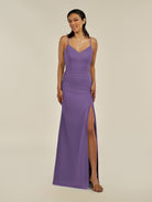 Kaelin is a sleek and elegant choice for your bridal party. Crafted from soft chiffon, she features a flattering V-neckline and a sleeveless bodice that highlights the shoulders with grace. Her floor-length sheath silhouette flows smoothly, enhanced by a subtle side slit for movement and modern sophistication. Finished with a smooth zipper back, Kaelin blends timeless style with contemporary elegance—perfect for weddings and special occasions.