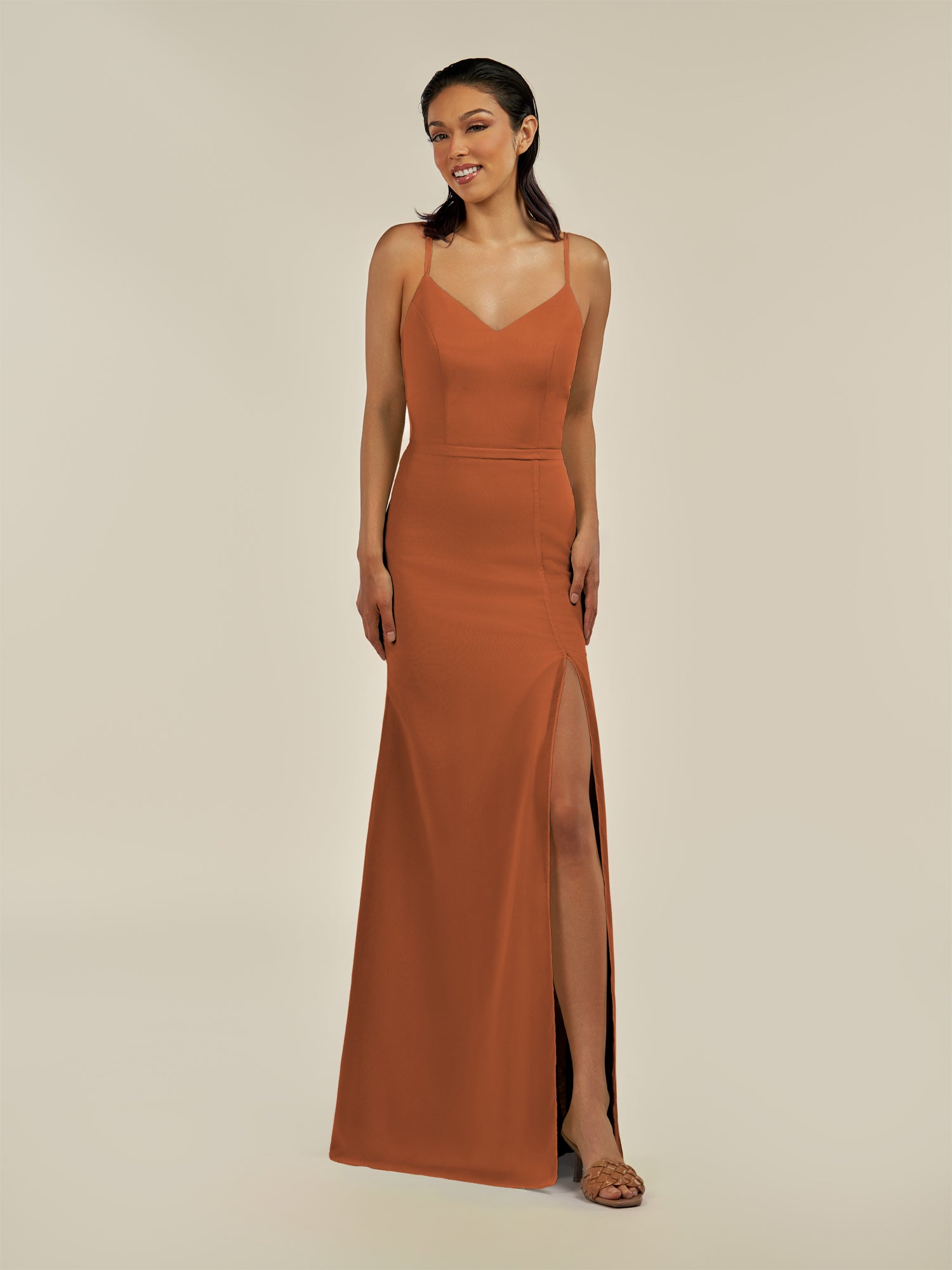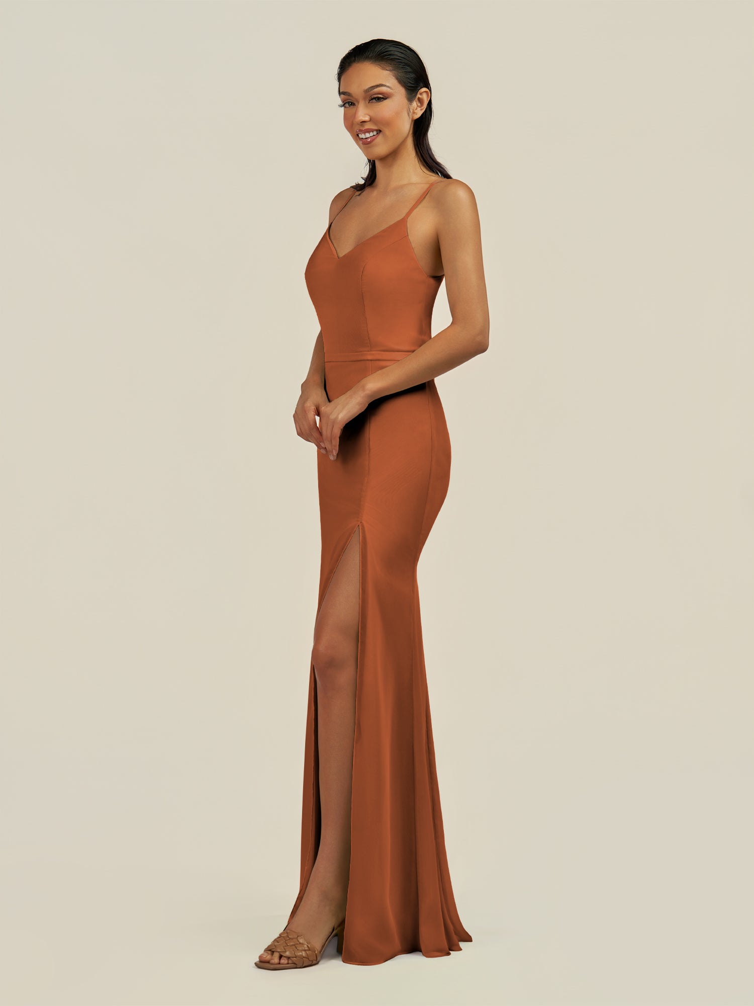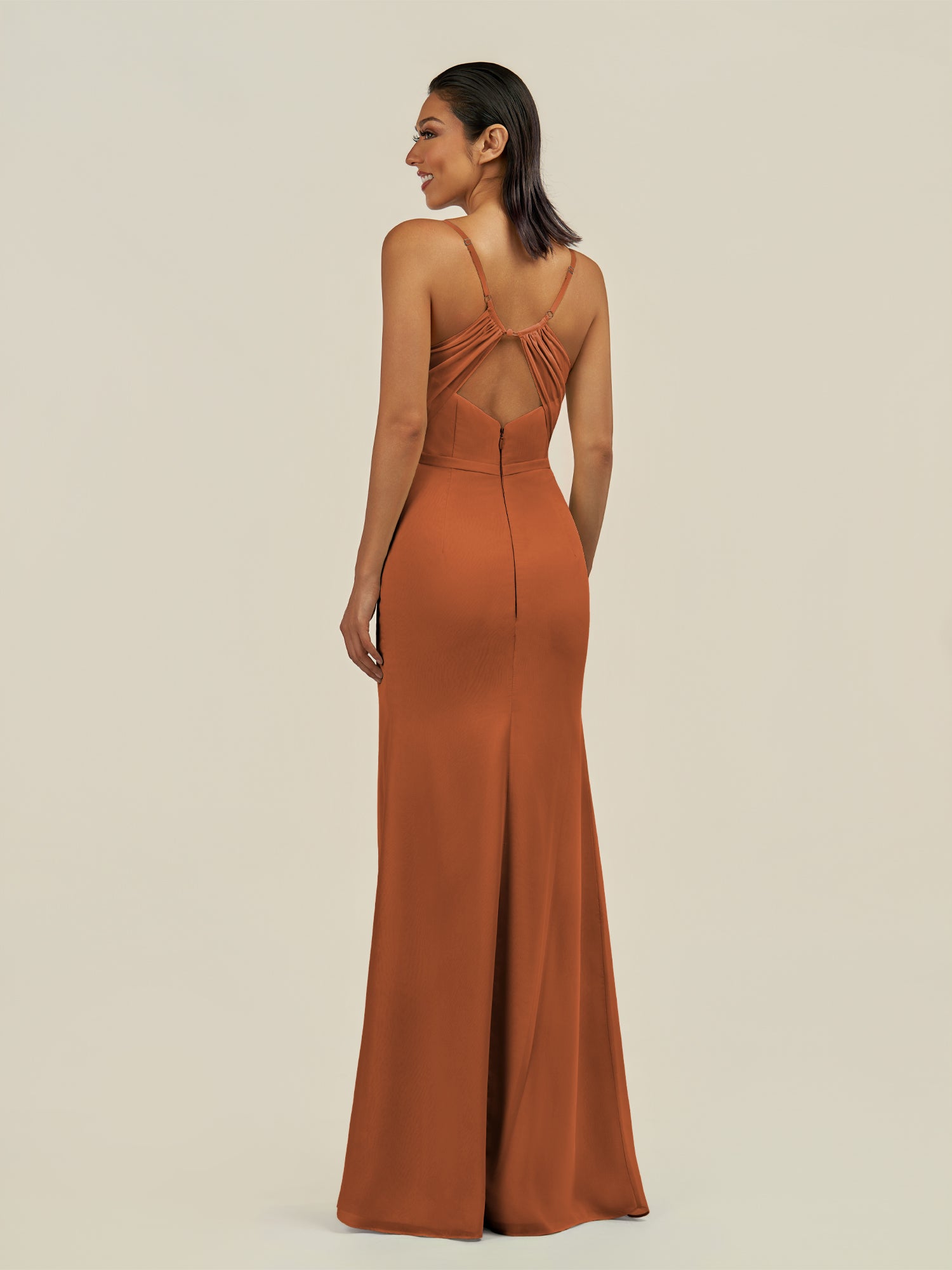 Kaelin is a sleek and elegant choice for your bridal party. Crafted from soft chiffon, she features a flattering V-neckline and a sleeveless bodice that highlights the shoulders with grace. Her floor-length sheath silhouette flows smoothly, enhanced by a subtle side slit for movement and modern sophistication. Finished with a smooth zipper back, Kaelin blends timeless style with contemporary elegance—perfect for weddings and special occasions.