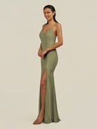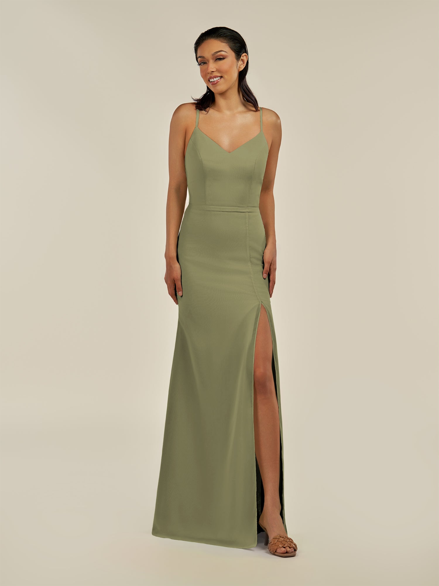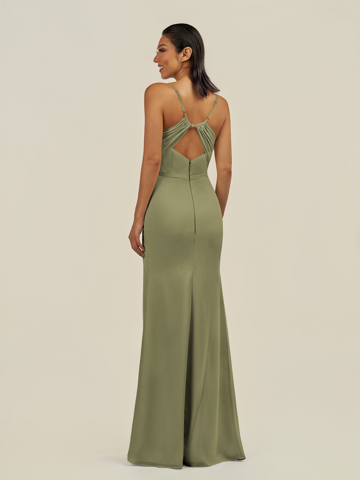 Kaelin is a sleek and elegant choice for your bridal party. Crafted from soft chiffon, she features a flattering V-neckline and a sleeveless bodice that highlights the shoulders with grace. Her floor-length sheath silhouette flows smoothly, enhanced by a subtle side slit for movement and modern sophistication. Finished with a smooth zipper back, Kaelin blends timeless style with contemporary elegance—perfect for weddings and special occasions.