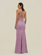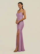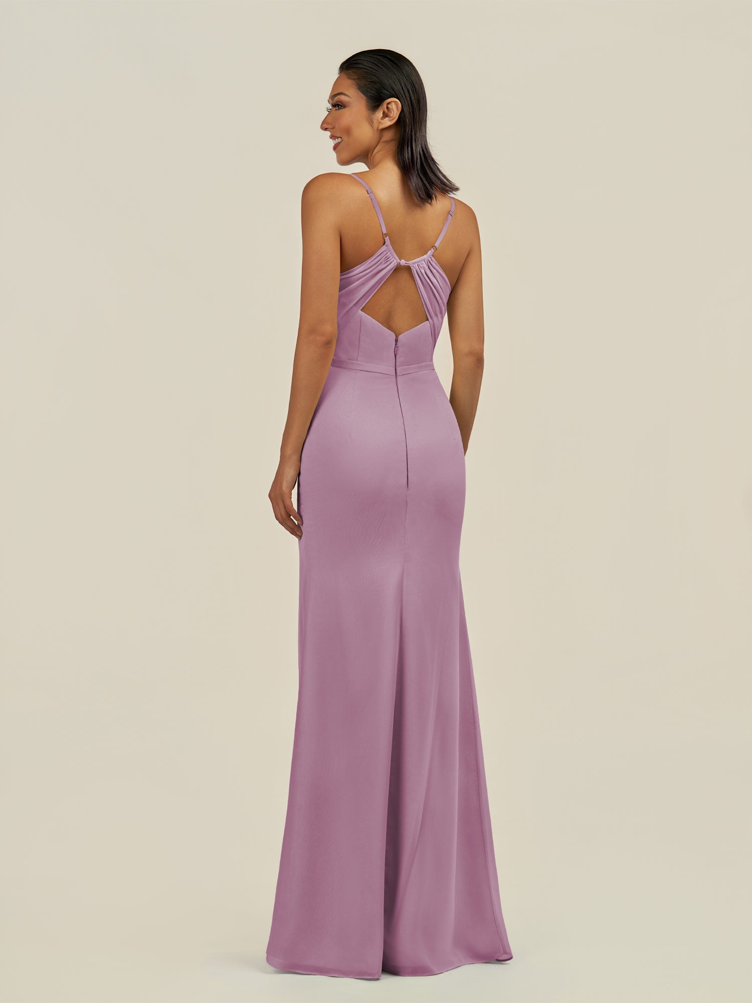 Kaelin is a sleek and elegant choice for your bridal party. Crafted from soft chiffon, she features a flattering V-neckline and a sleeveless bodice that highlights the shoulders with grace. Her floor-length sheath silhouette flows smoothly, enhanced by a subtle side slit for movement and modern sophistication. Finished with a smooth zipper back, Kaelin blends timeless style with contemporary elegance—perfect for weddings and special occasions.