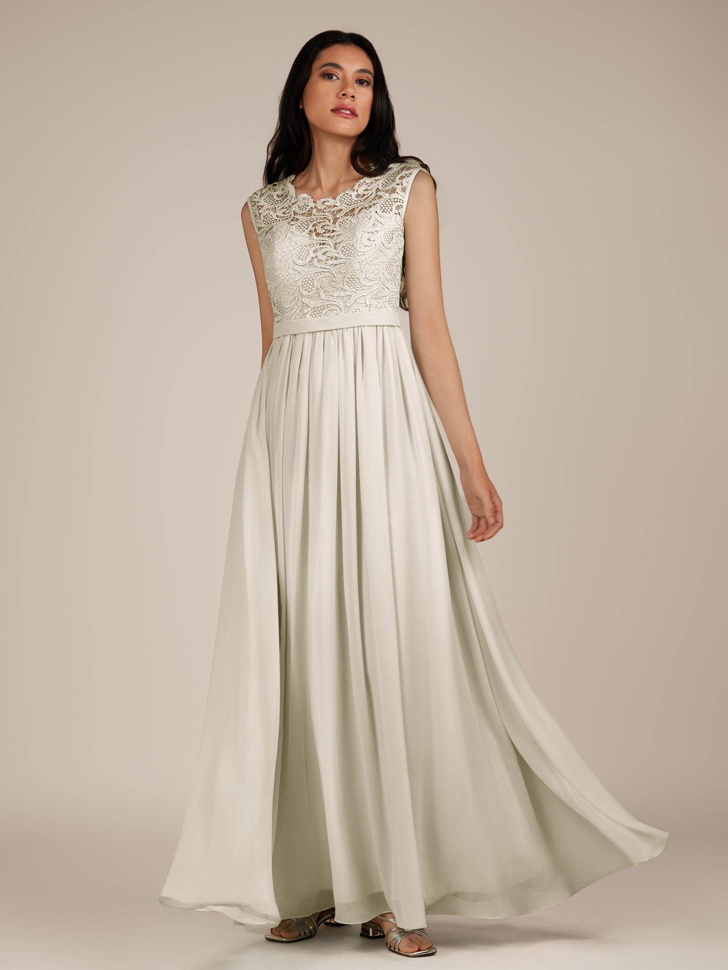 Niamh brings a touch of ethereal romance to the bridal party in her soft chiffon. The A-line silhouette flows effortlessly from the waist, creating a graceful and timeless look. Her illusion neckline offers a hint of modern allure, delicately framed by lace appliqués that add intricate texture and femininity. Finished with a zipper back for a smooth, flattering fit, Niamh is the picture of understated elegance—perfect for a garden wedding or any dreamy celebration.