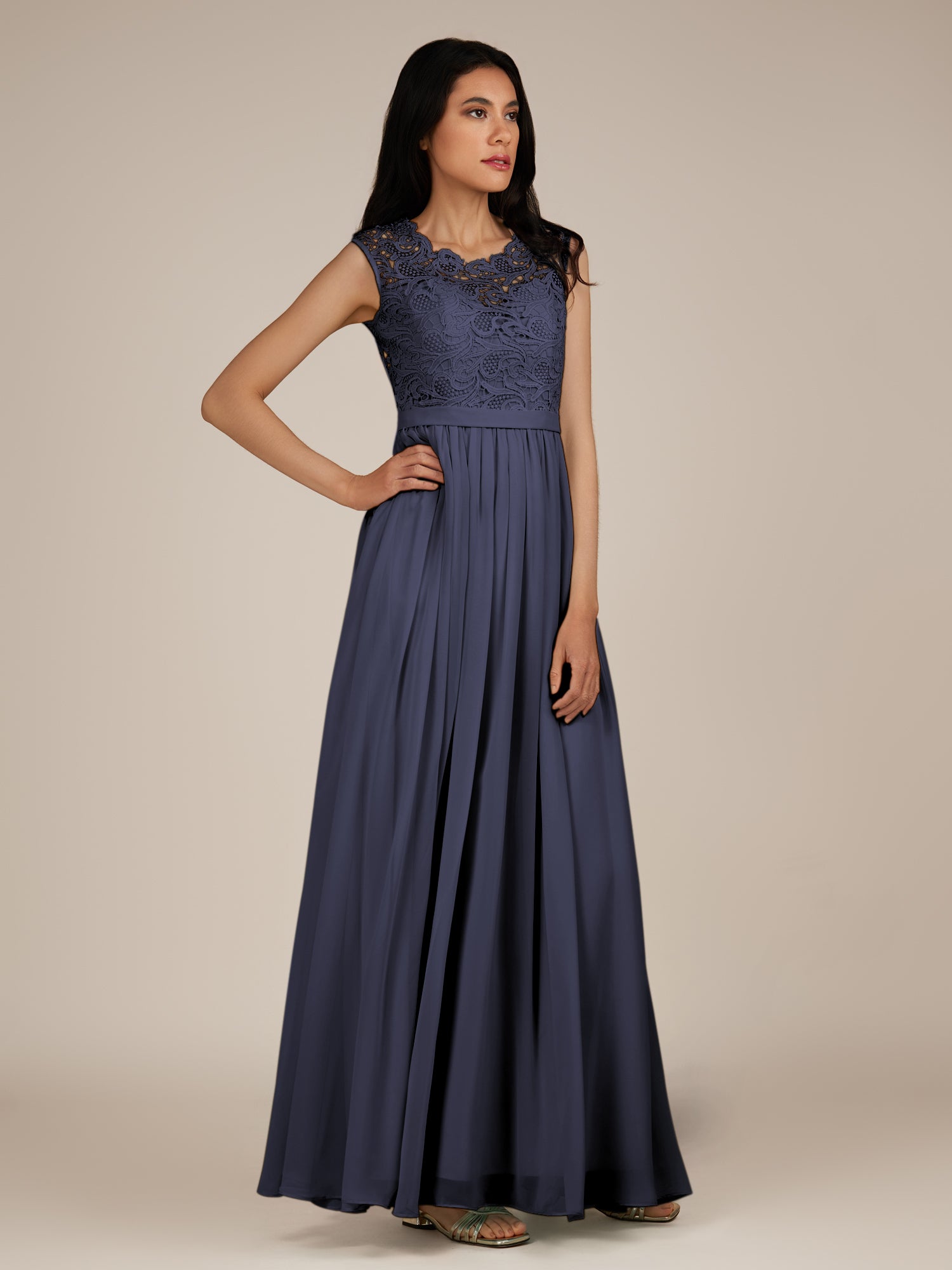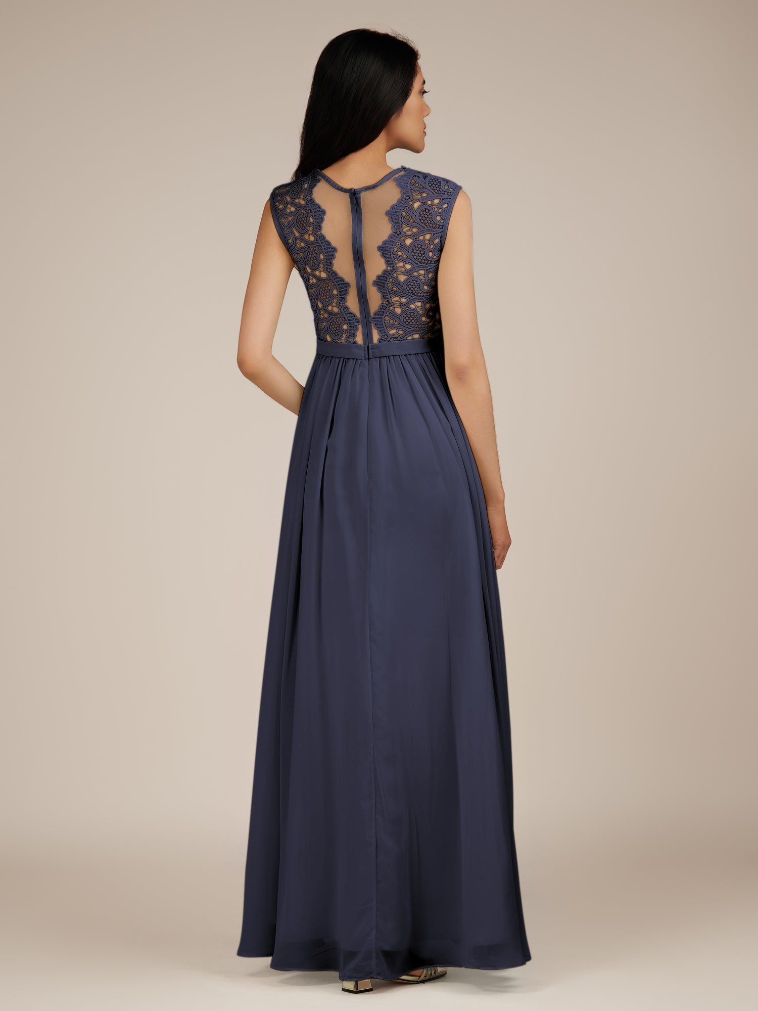 Niamh | Dusk Blue - A Line Illusion Neck Chiffon Long Bridesmaid Dress