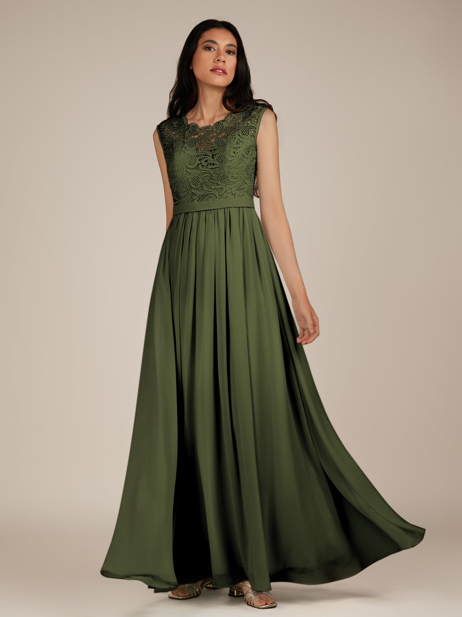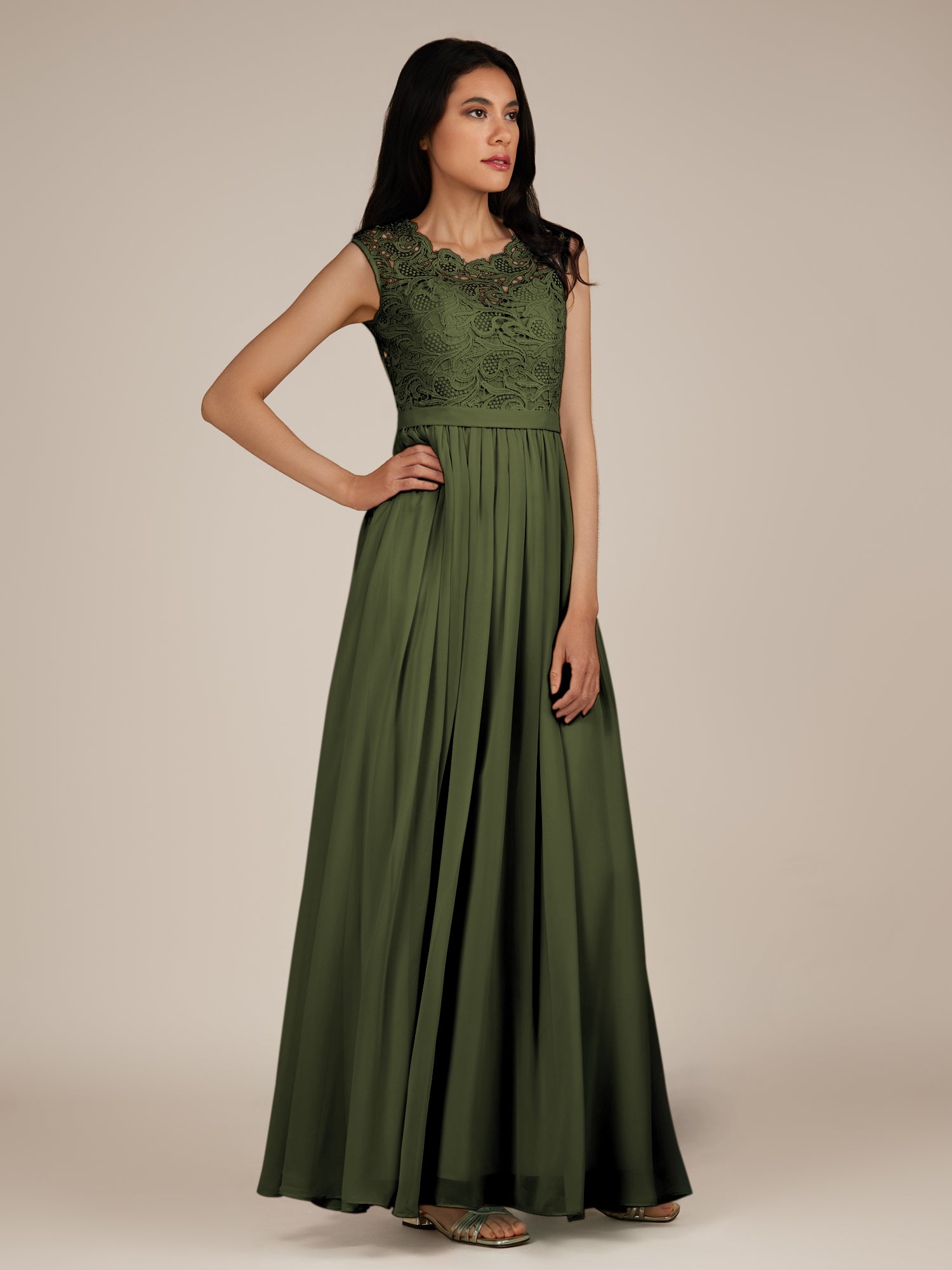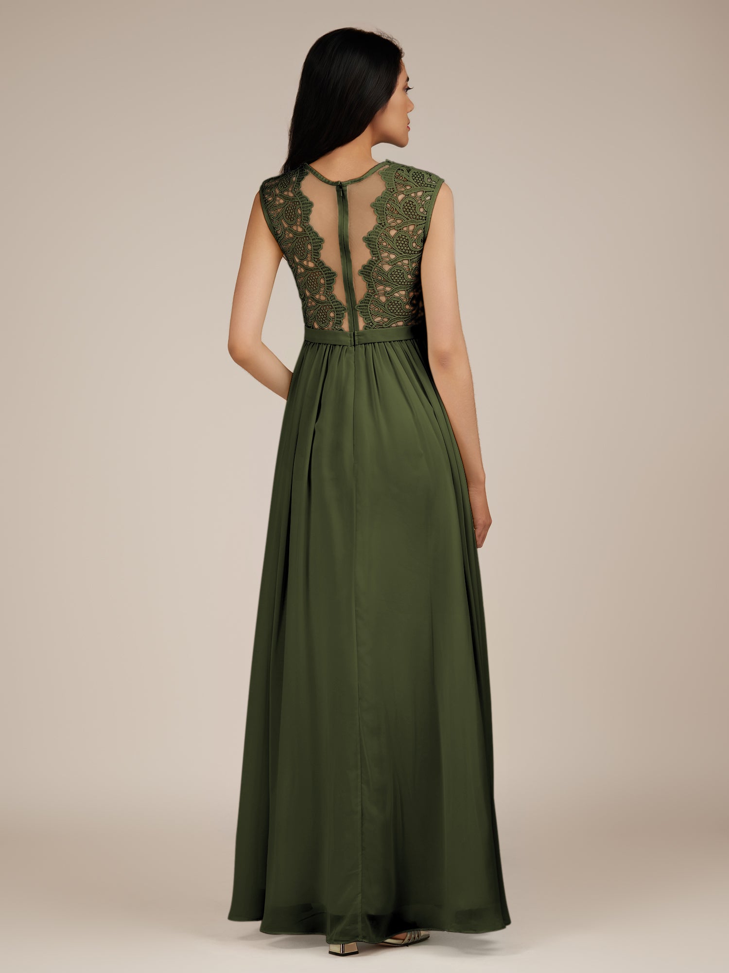 Niamh | Olive - A Line Illusion Neck Chiffon Long Bridesmaid Dress