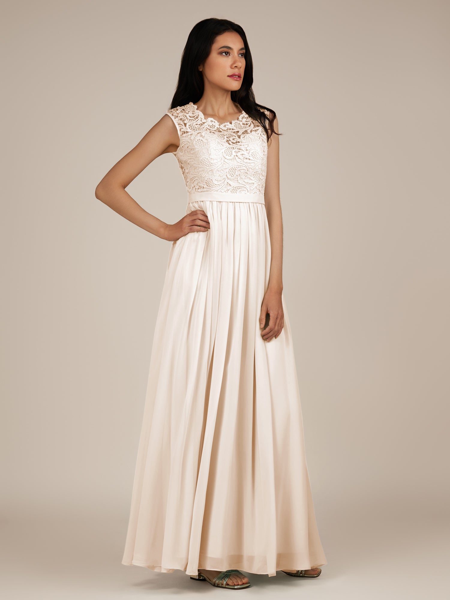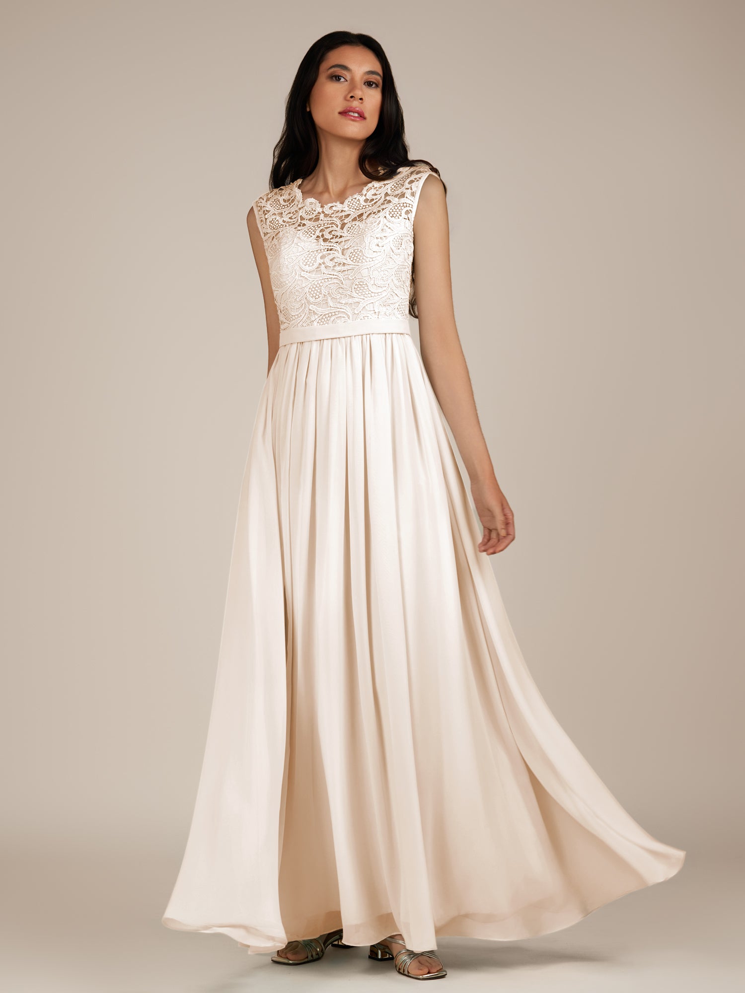 Niamh brings a touch of ethereal romance to the bridal party in her soft chiffon. The A-line silhouette flows effortlessly from the waist, creating a graceful and timeless look. Her illusion neckline offers a hint of modern allure, delicately framed by lace appliqués that add intricate texture and femininity. Finished with a zipper back for a smooth, flattering fit, Niamh is the picture of understated elegance—perfect for a garden wedding or any dreamy celebration.