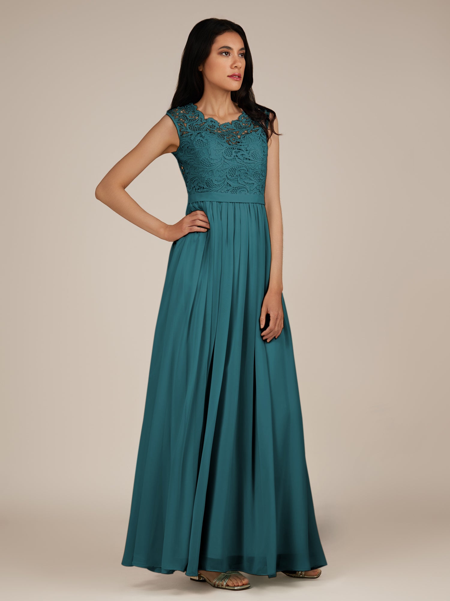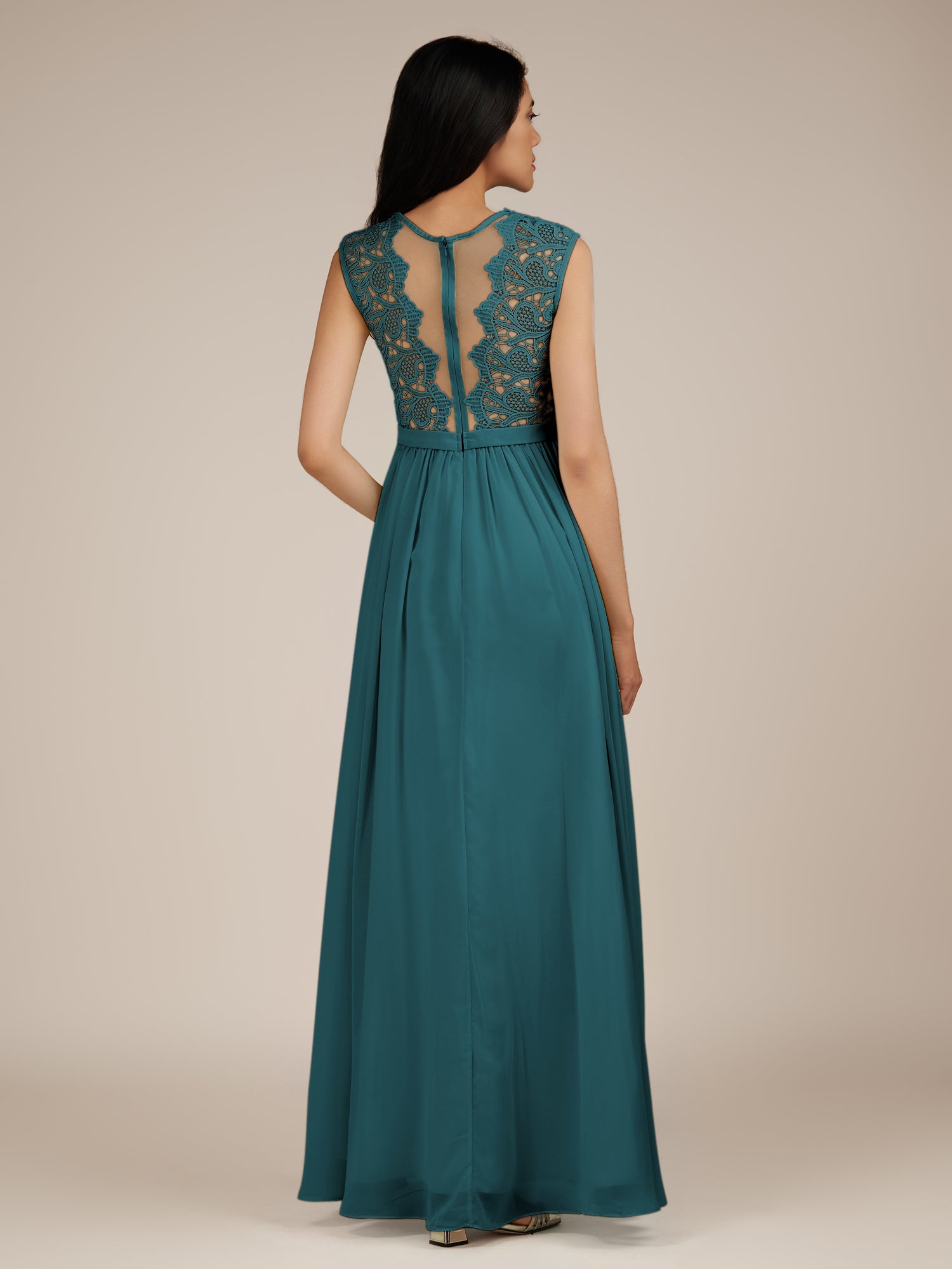 Niamh | Pine - A Line Illusion Neck Chiffon Long Bridesmaid Dress