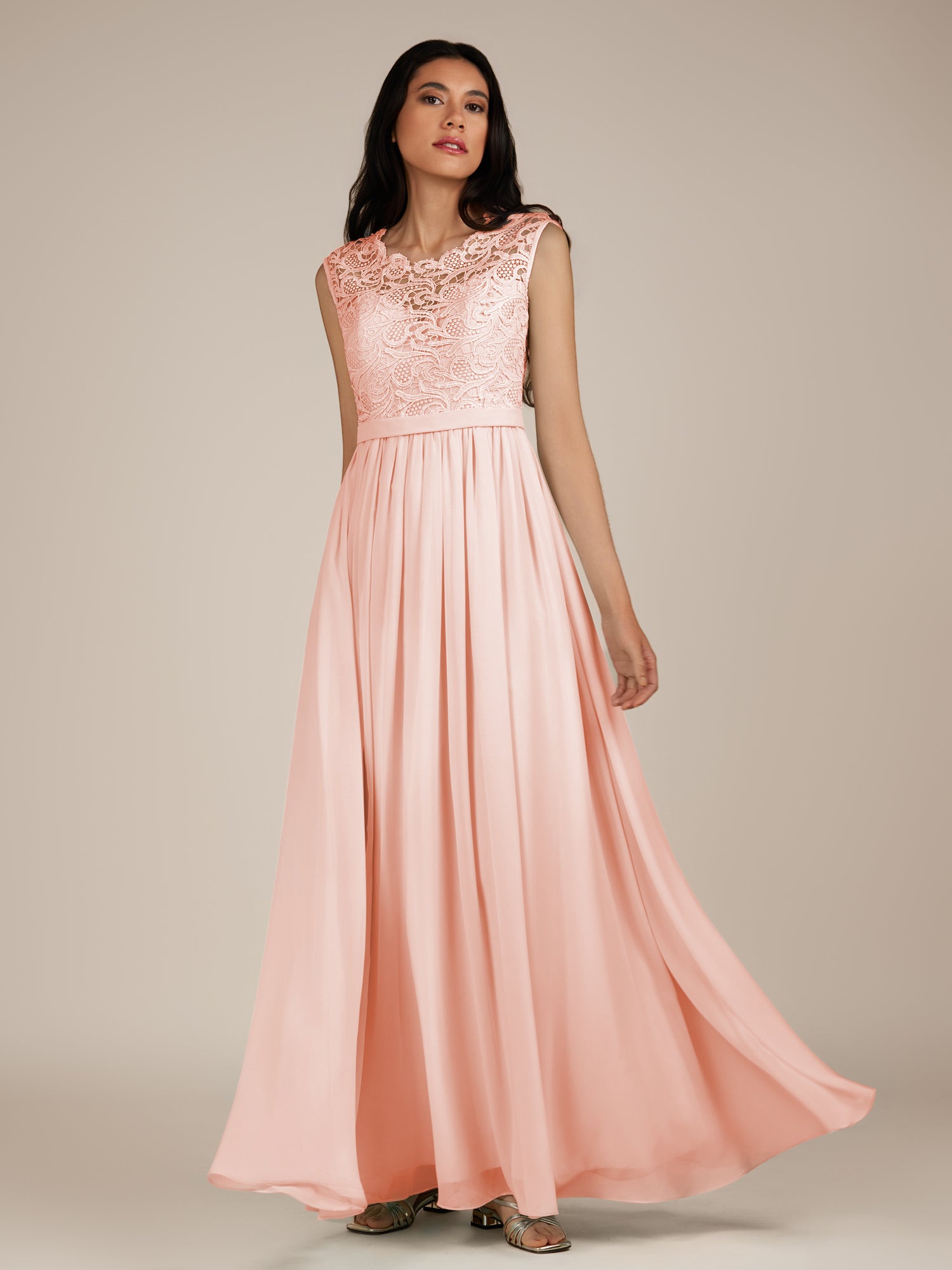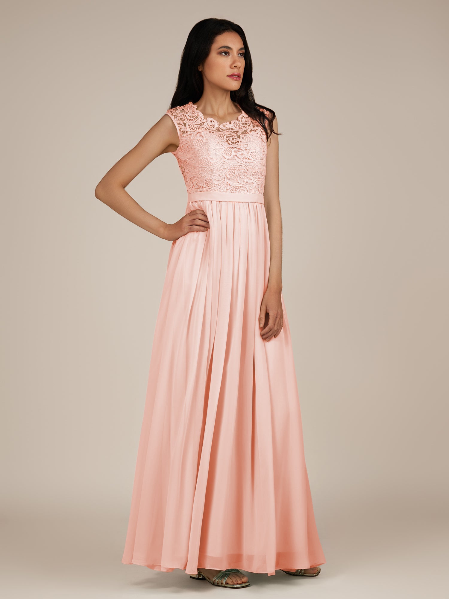 Niamh | Rose Petal - A Line Illusion Neck Chiffon Long Bridesmaid Dress