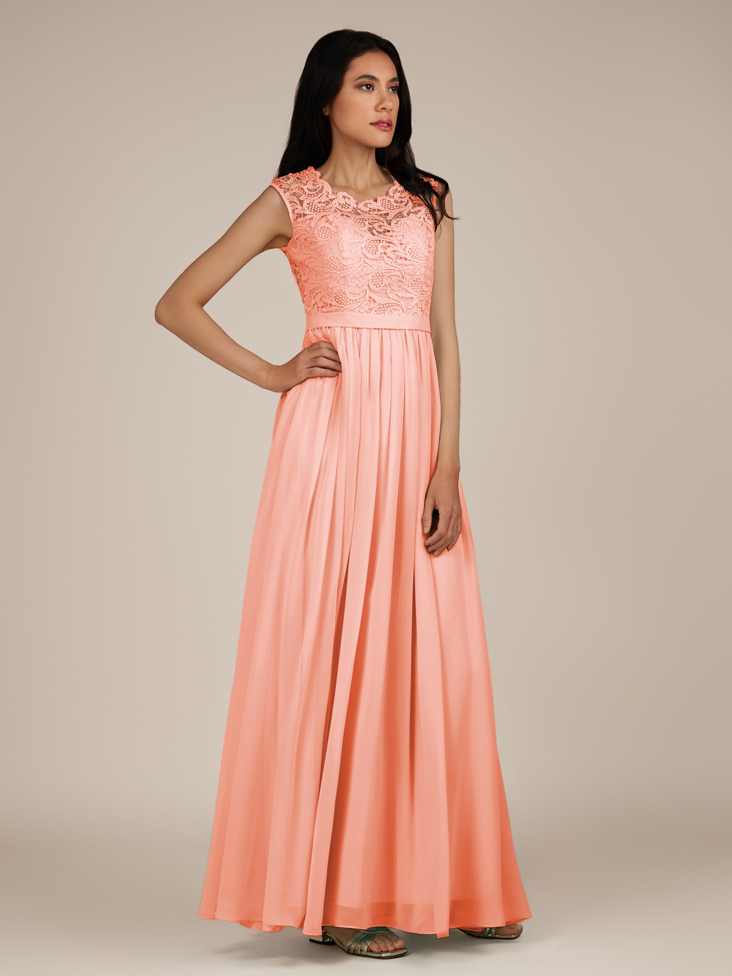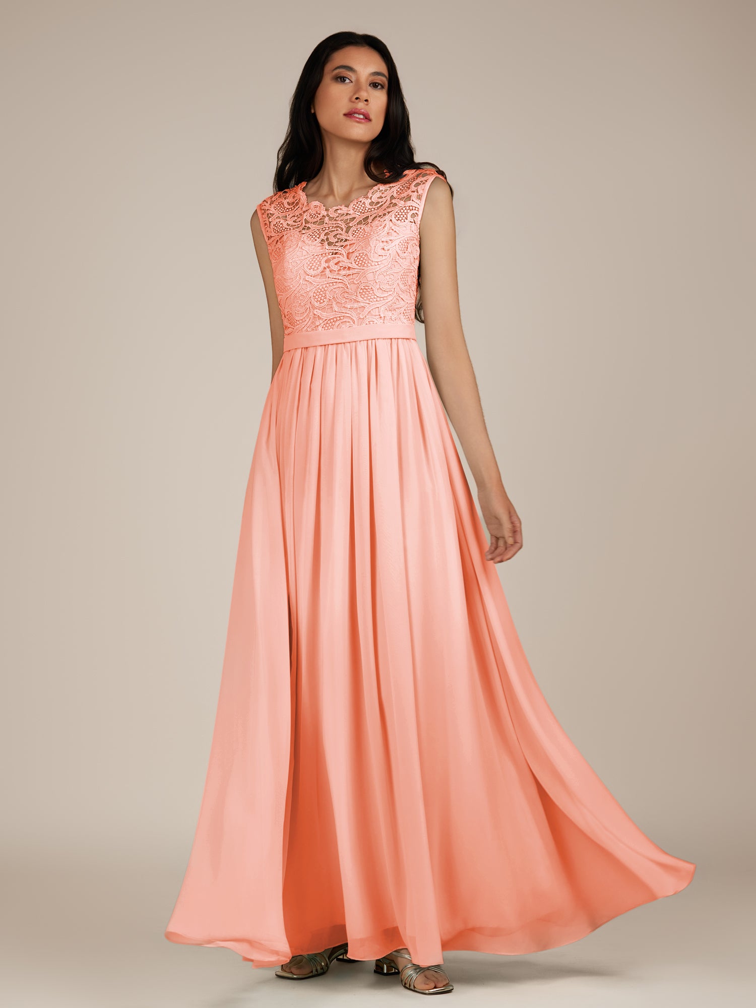 Niamh brings a touch of ethereal romance to the bridal party in her soft chiffon. The A-line silhouette flows effortlessly from the waist, creating a graceful and timeless look. Her illusion neckline offers a hint of modern allure, delicately framed by lace appliqués that add intricate texture and femininity. Finished with a zipper back for a smooth, flattering fit, Niamh is the picture of understated elegance—perfect for a garden wedding or any dreamy celebration.