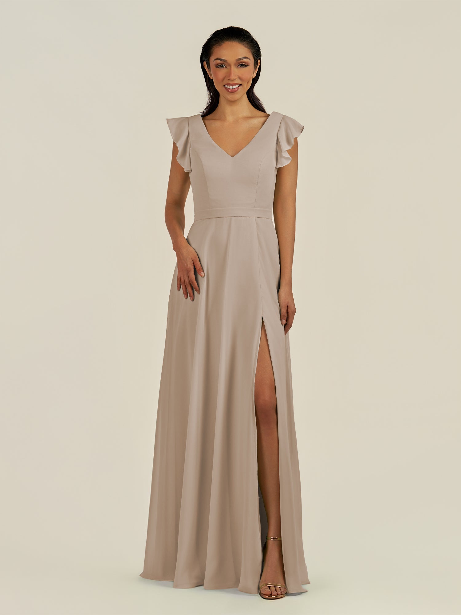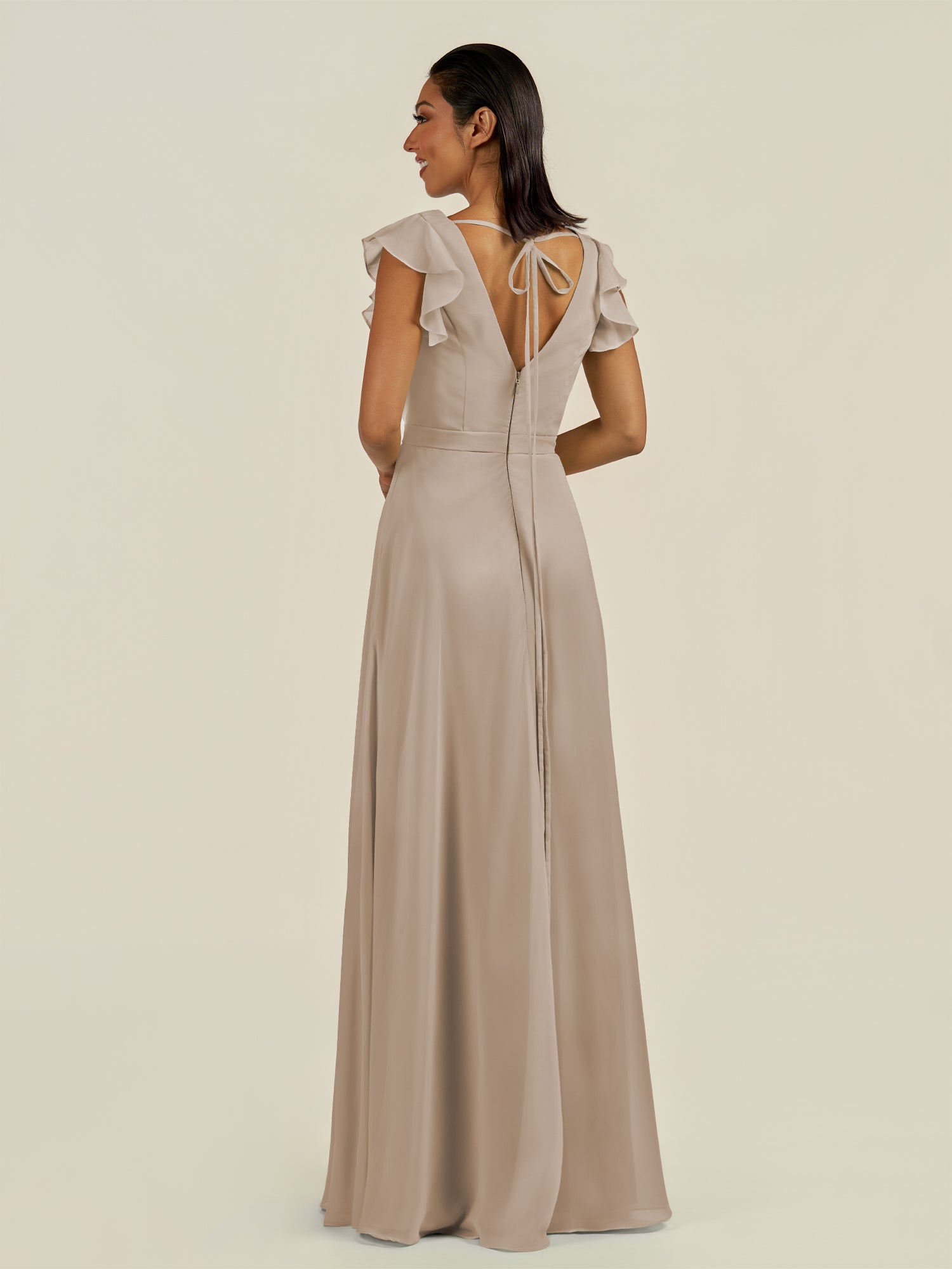 Orlina is a vision of delicate elegance and modern romance. Made from soft chiffon, she features a deep V-neckline and cap sleeves with flutter details that add a whimsical touch. Her floor-length A-line skirt flows gracefully, enhanced by side slit, while the tie-back closure provides a customizable, flattering fit. Orlina is perfect for bridesmaids seeking a light, airy, and sophisticated silhoue.