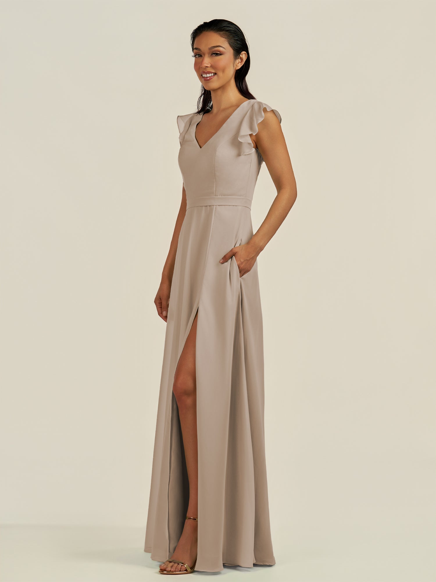 Orlina | Almond - A Line Chiffon V Neck Long Bridesmaid Dress with Flutter Sleeves
