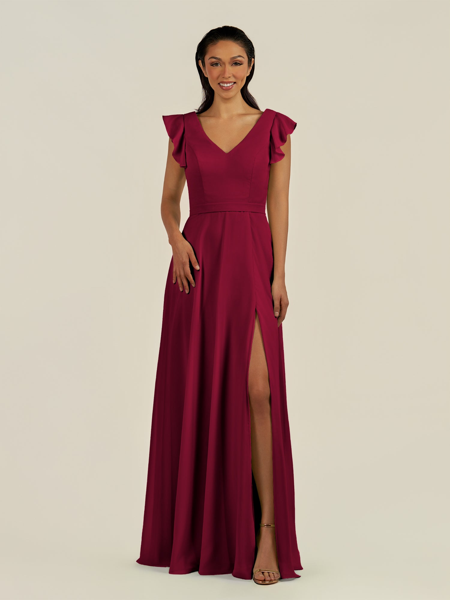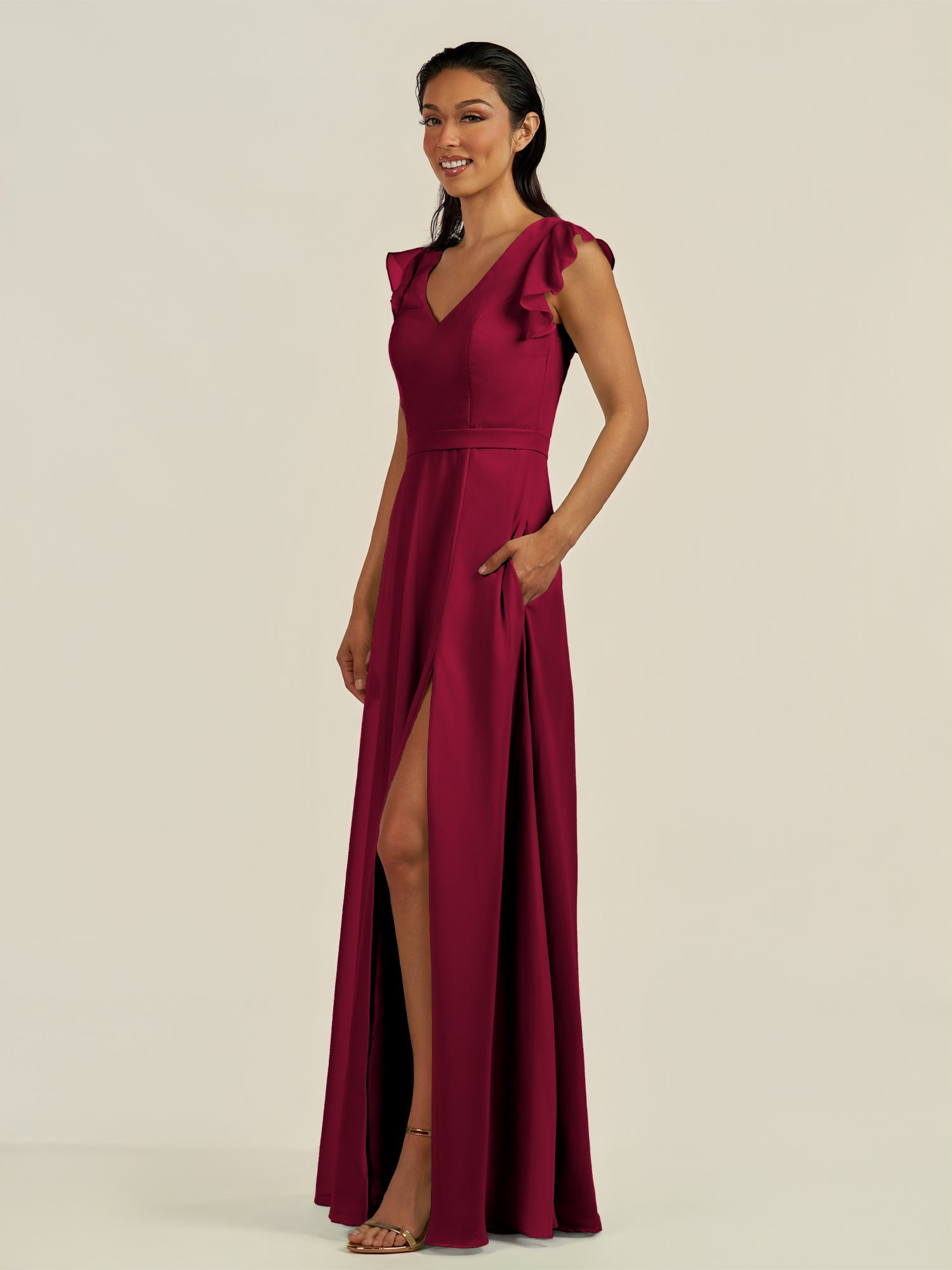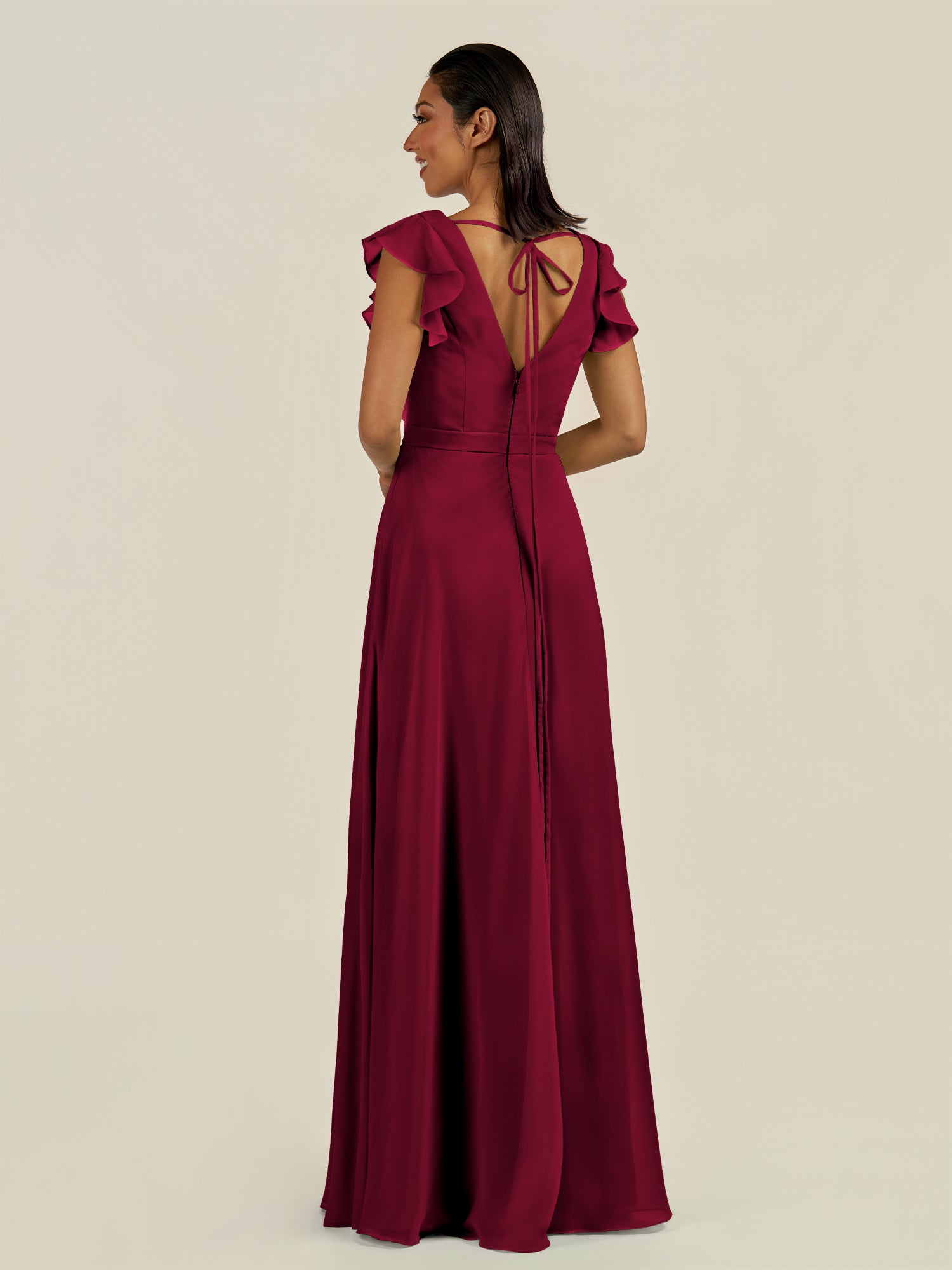 Orlina is a vision of delicate elegance and modern romance. Made from soft chiffon, she features a deep V-neckline and cap sleeves with flutter details that add a whimsical touch. Her floor-length A-line skirt flows gracefully, enhanced by side slit, while the tie-back closure provides a customizable, flattering fit. Orlina is perfect for bridesmaids seeking a light, airy, and sophisticated silhoue.