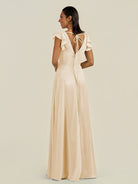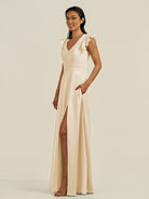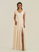 Orlina | Champagne - A Line Chiffon V Neck Long Bridesmaid Dress with Flutter Sleeves