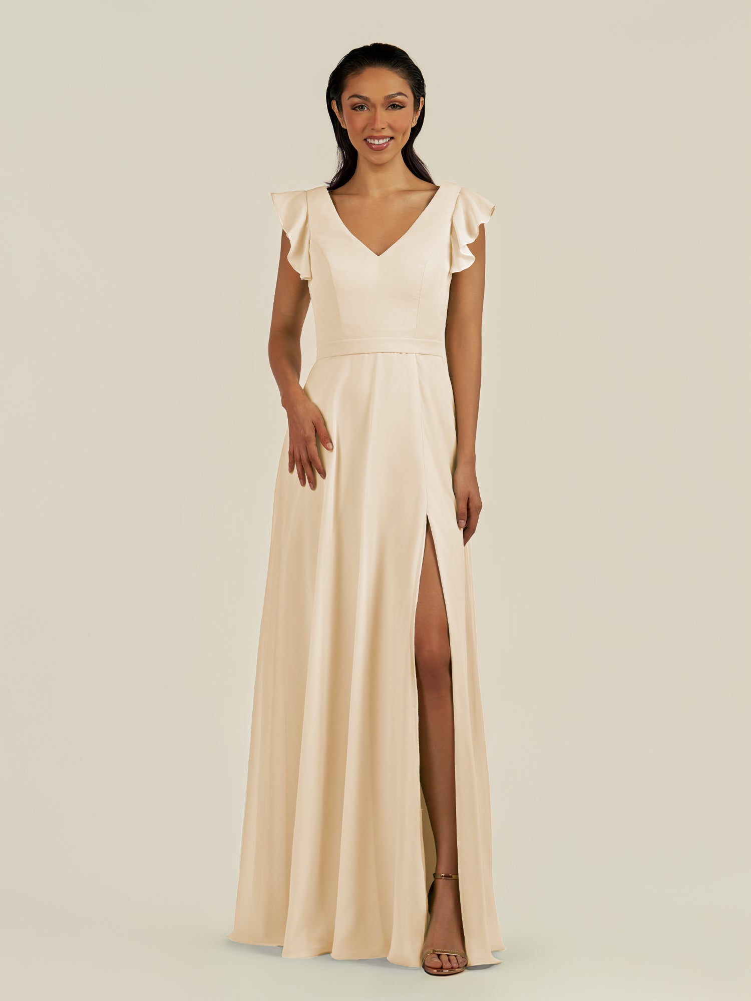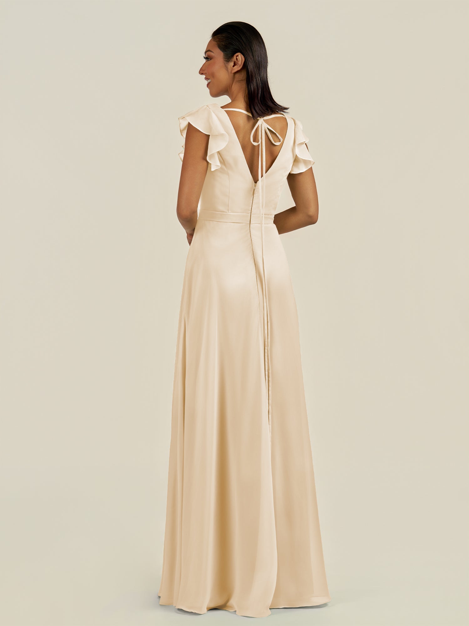 Orlina is a vision of delicate elegance and modern romance. Made from soft chiffon, she features a deep V-neckline and cap sleeves with flutter details that add a whimsical touch. Her floor-length A-line skirt flows gracefully, enhanced by side slit, while the tie-back closure provides a customizable, flattering fit. Orlina is perfect for bridesmaids seeking a light, airy, and sophisticated silhoue.