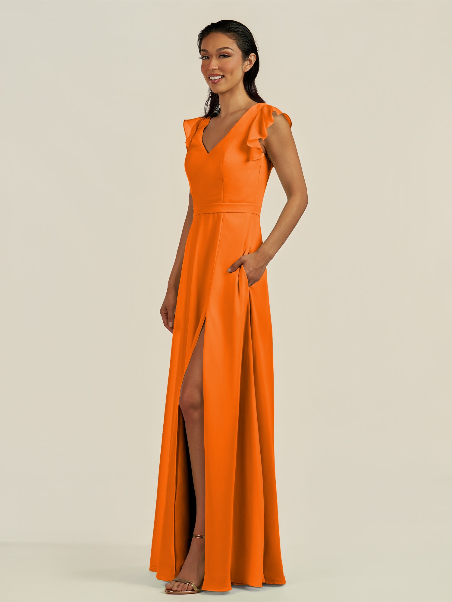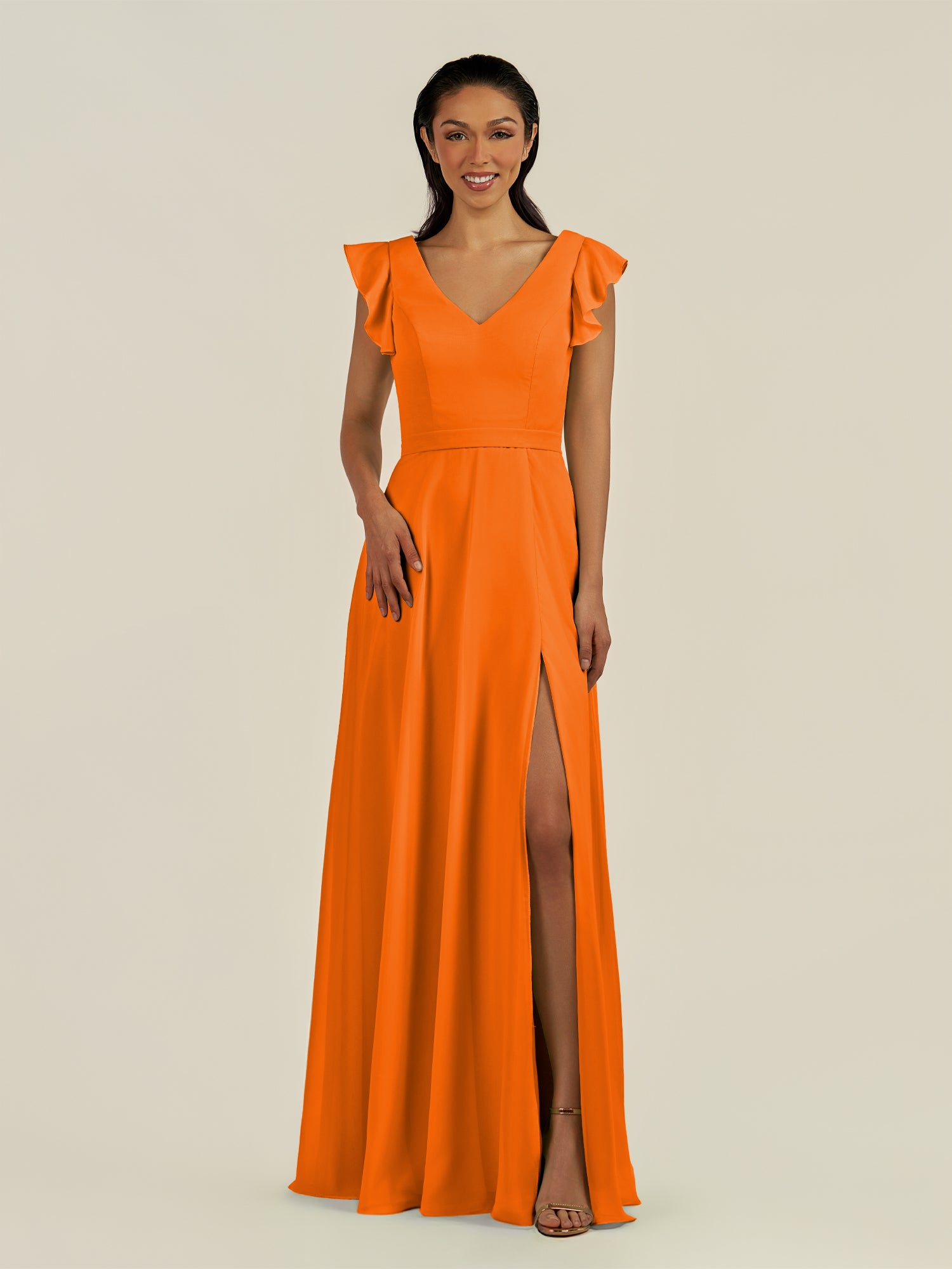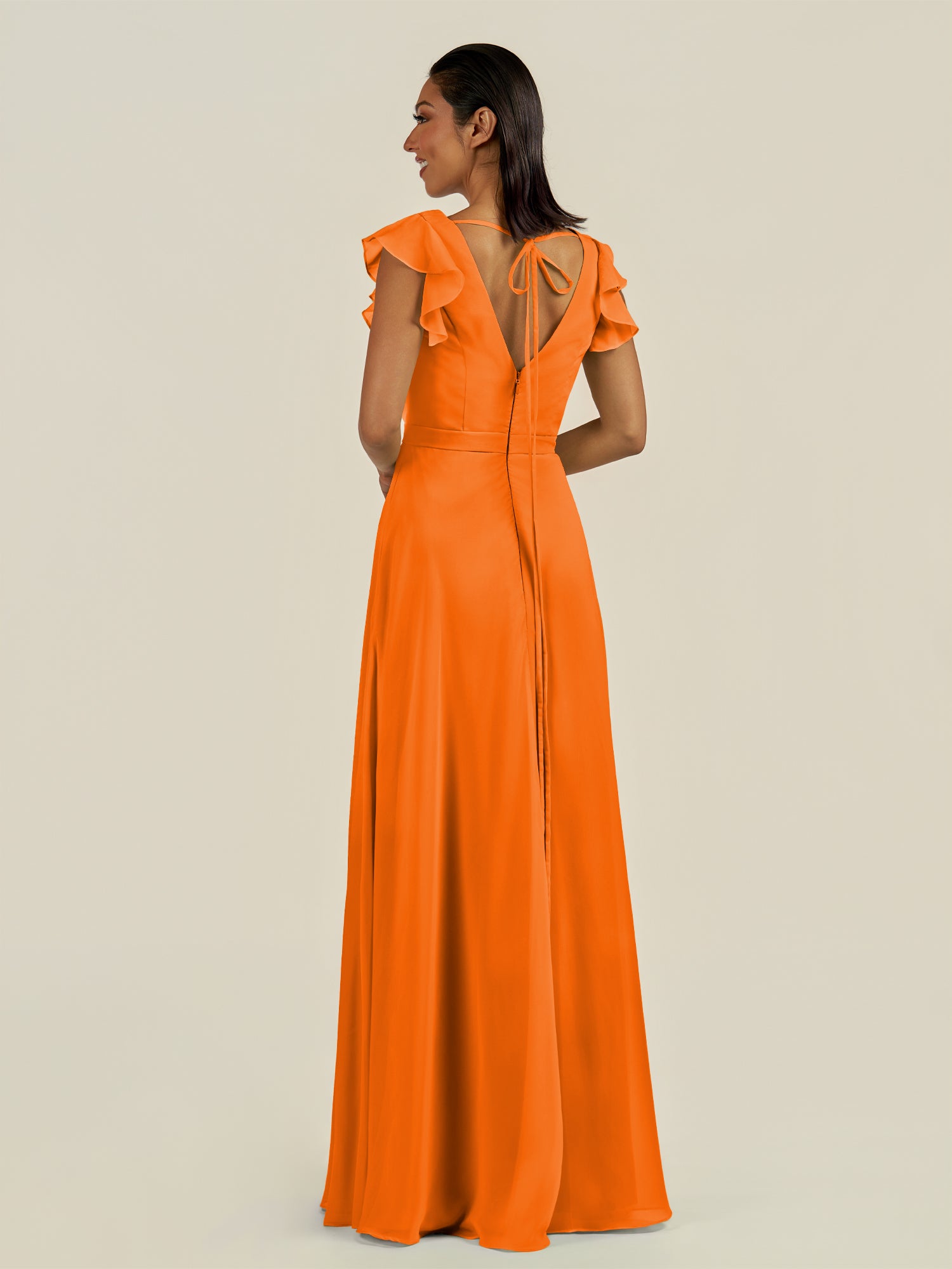 Orlina is a vision of delicate elegance and modern romance. Made from soft chiffon, she features a deep V-neckline and cap sleeves with flutter details that add a whimsical touch. Her floor-length A-line skirt flows gracefully, enhanced by side slit, while the tie-back closure provides a customizable, flattering fit. Orlina is perfect for bridesmaids seeking a light, airy, and sophisticated silhoue.