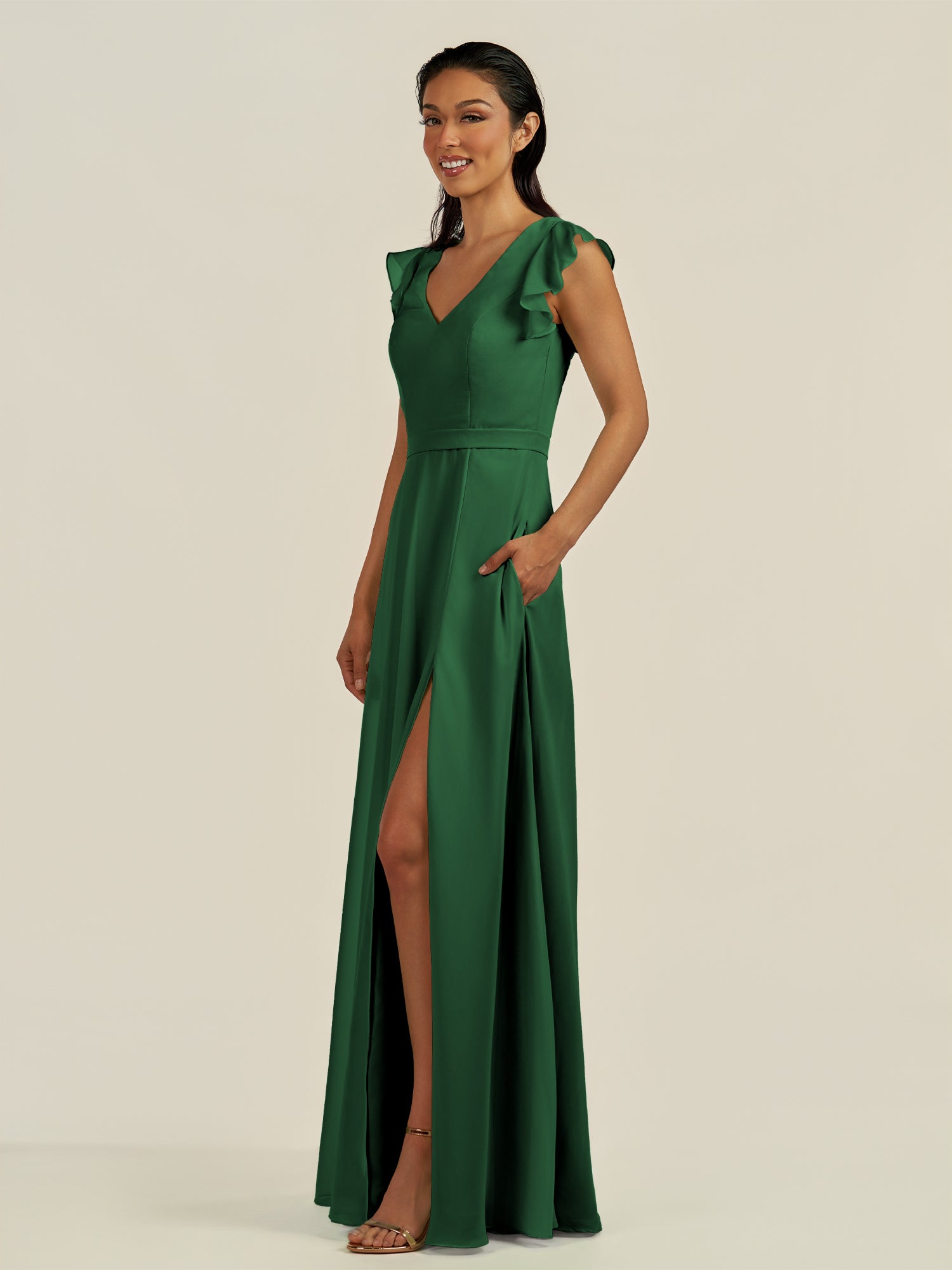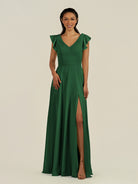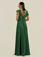 Orlina | Dark Green - A Line Chiffon V Neck Long Bridesmaid Dress with Flutter Sleeves