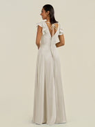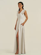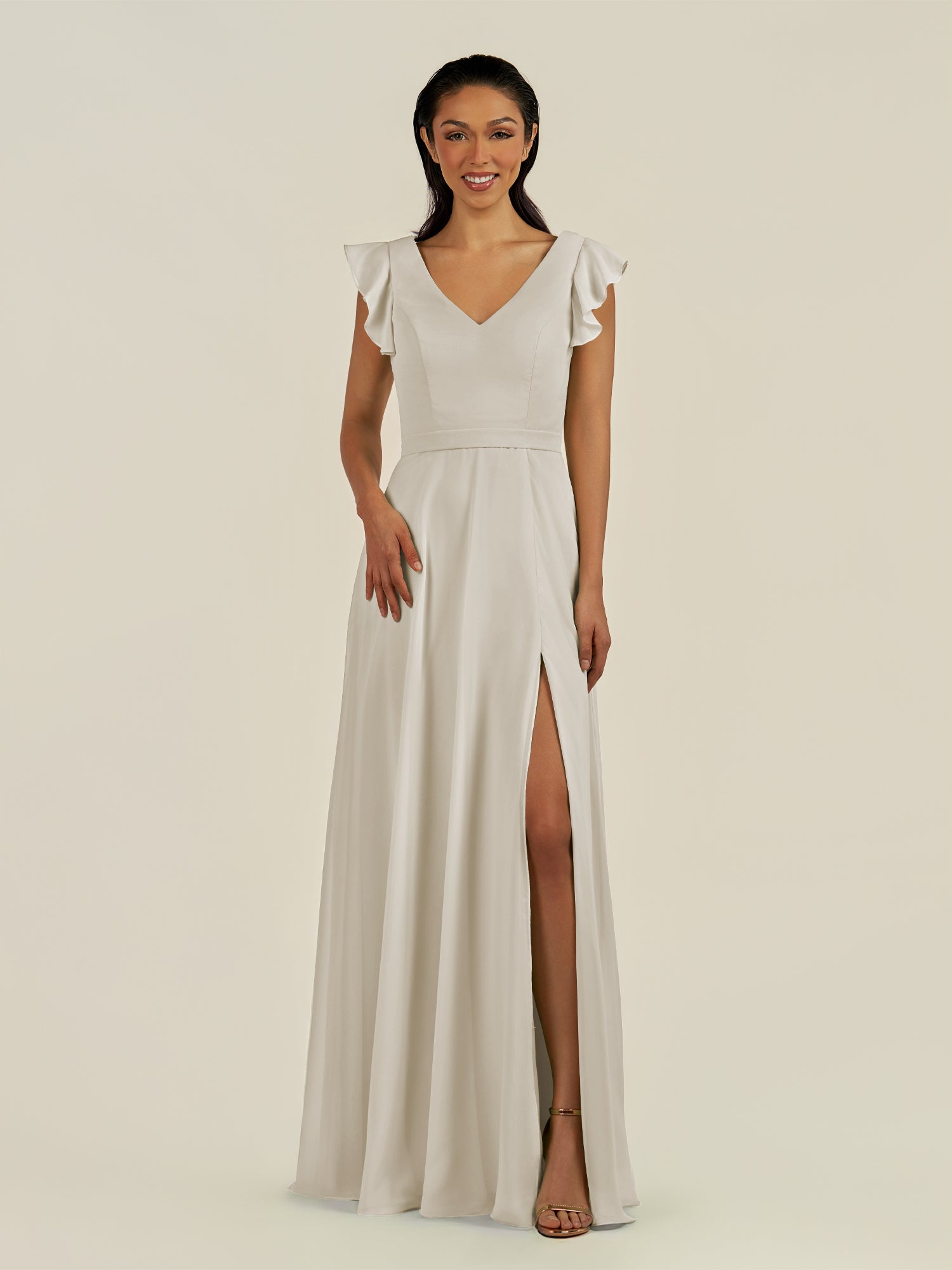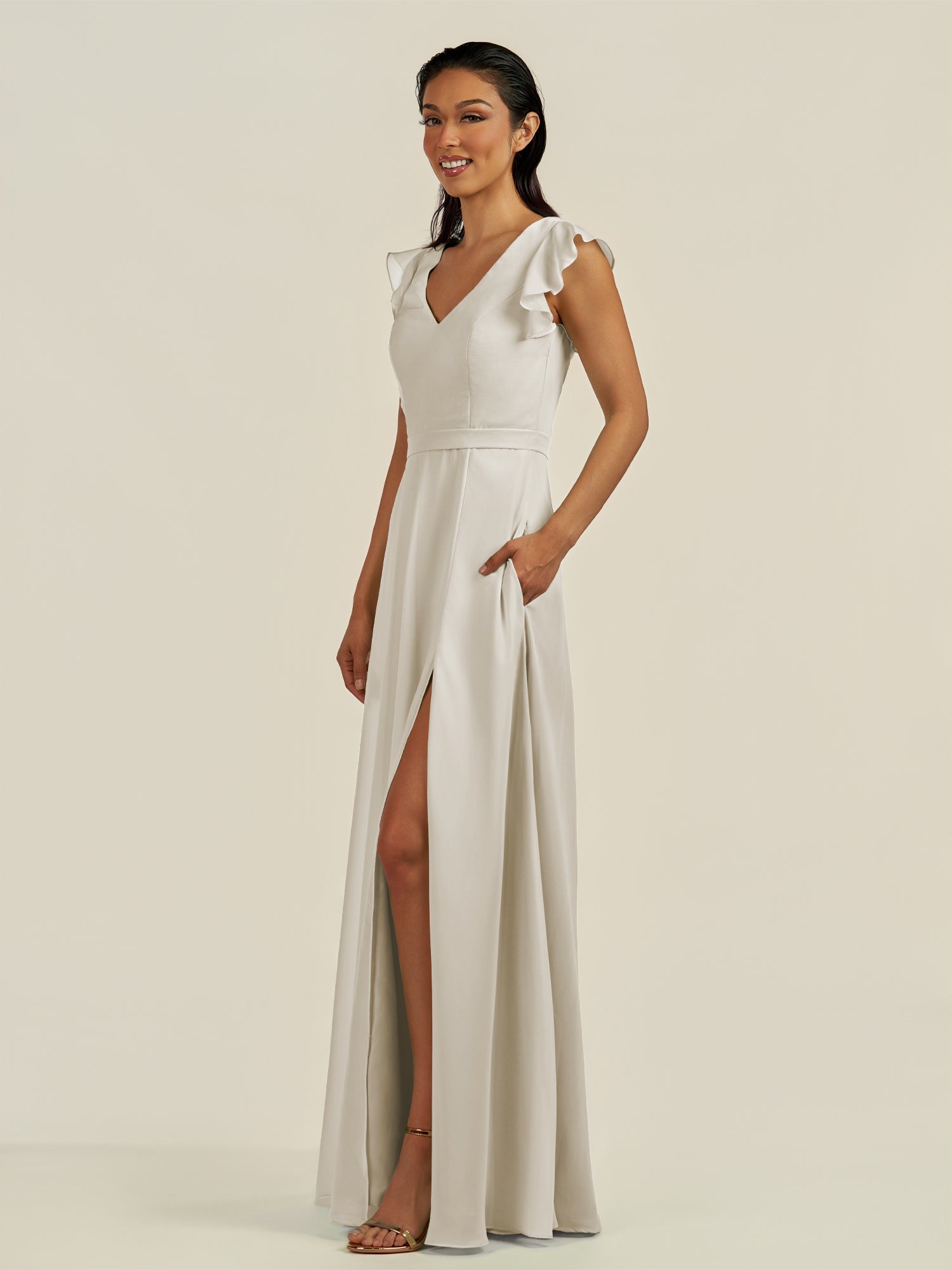Orlina is a vision of delicate elegance and modern romance. Made from soft chiffon, she features a deep V-neckline and cap sleeves with flutter details that add a whimsical touch. Her floor-length A-line skirt flows gracefully, enhanced by side slit, while the tie-back closure provides a customizable, flattering fit. Orlina is perfect for bridesmaids seeking a light, airy, and sophisticated silhoue.