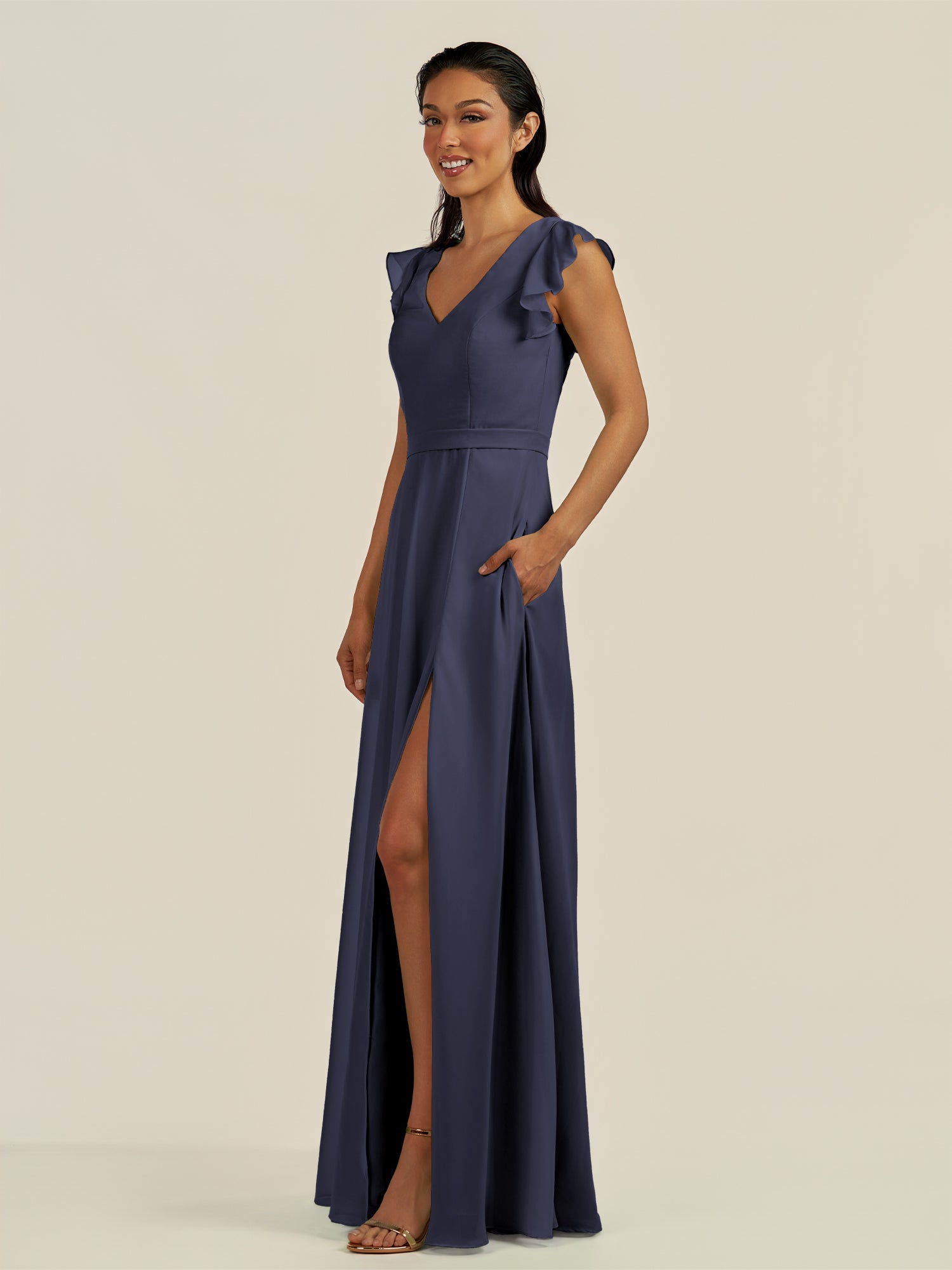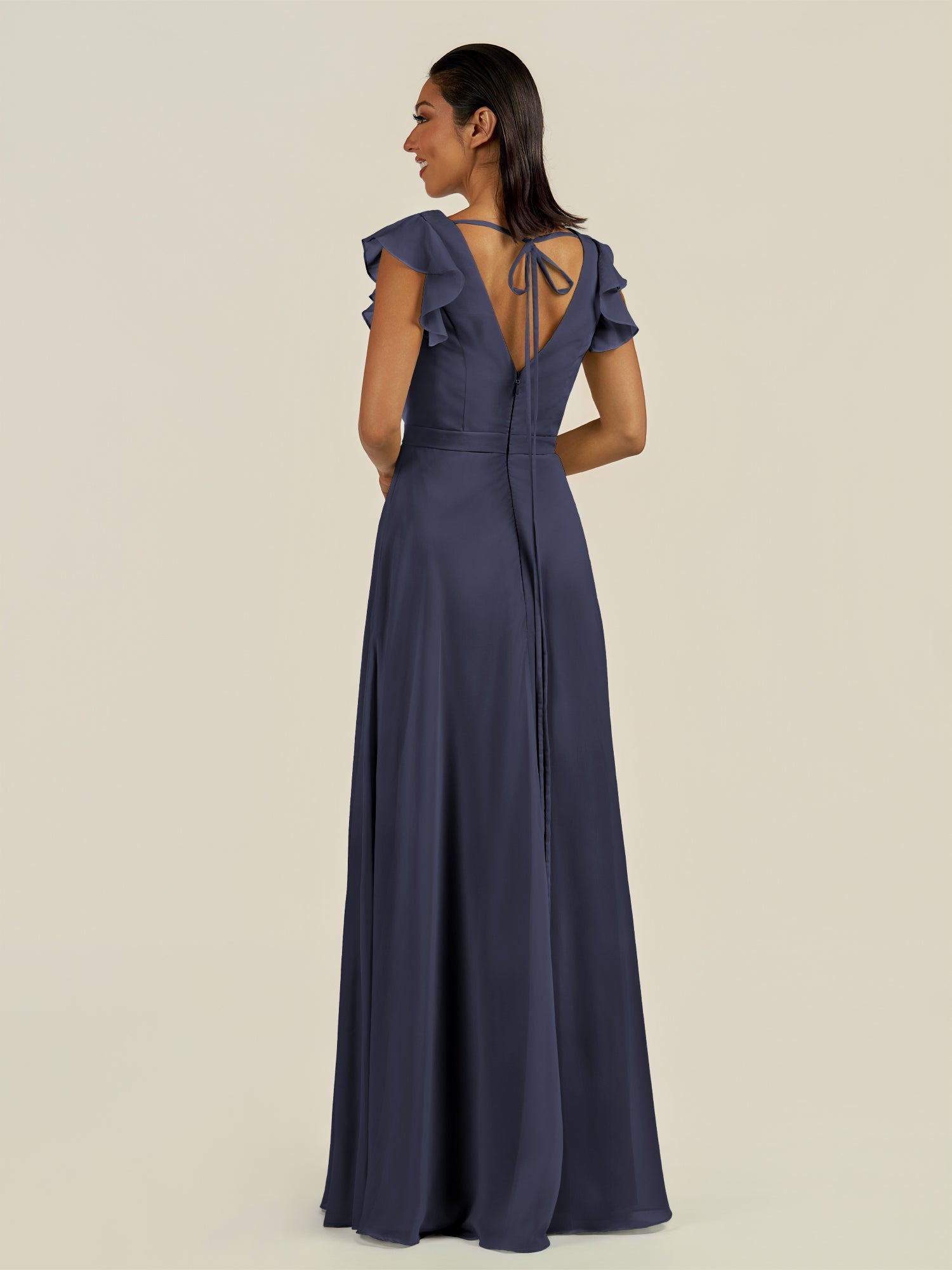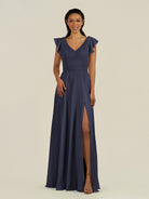 Orlina is a vision of delicate elegance and modern romance. Made from soft chiffon, she features a deep V-neckline and cap sleeves with flutter details that add a whimsical touch. Her floor-length A-line skirt flows gracefully, enhanced by side slit, while the tie-back closure provides a customizable, flattering fit. Orlina is perfect for bridesmaids seeking a light, airy, and sophisticated silhoue.
