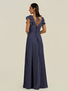 Orlina | Dusk Blue - A Line Chiffon V Neck Long Bridesmaid Dress with Flutter Sleeves