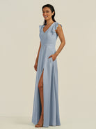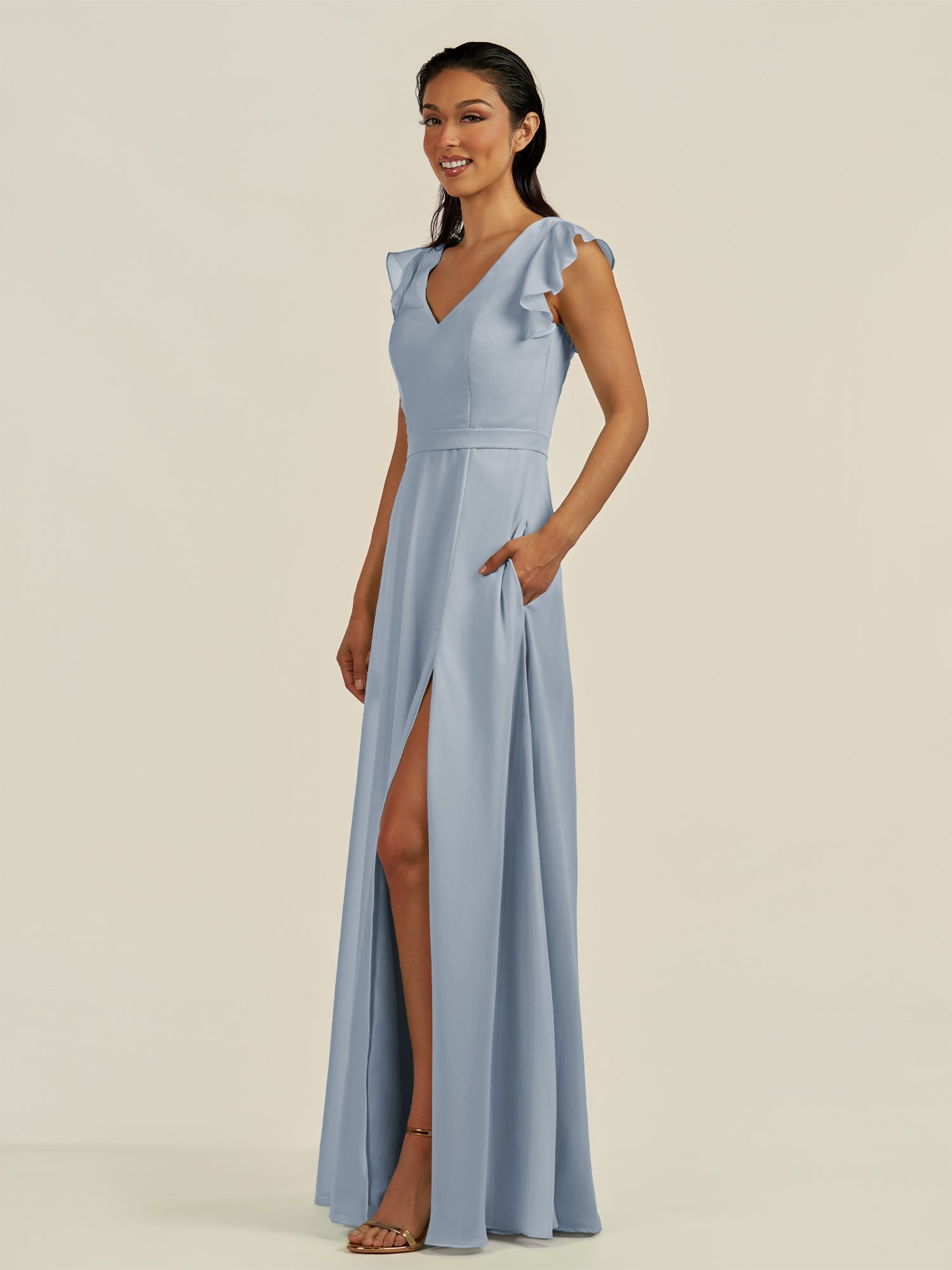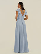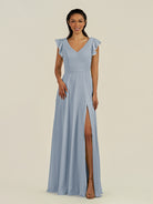 Orlina | Dusty Blue - A Line Chiffon V Neck Long Bridesmaid Dress with Flutter Sleeves