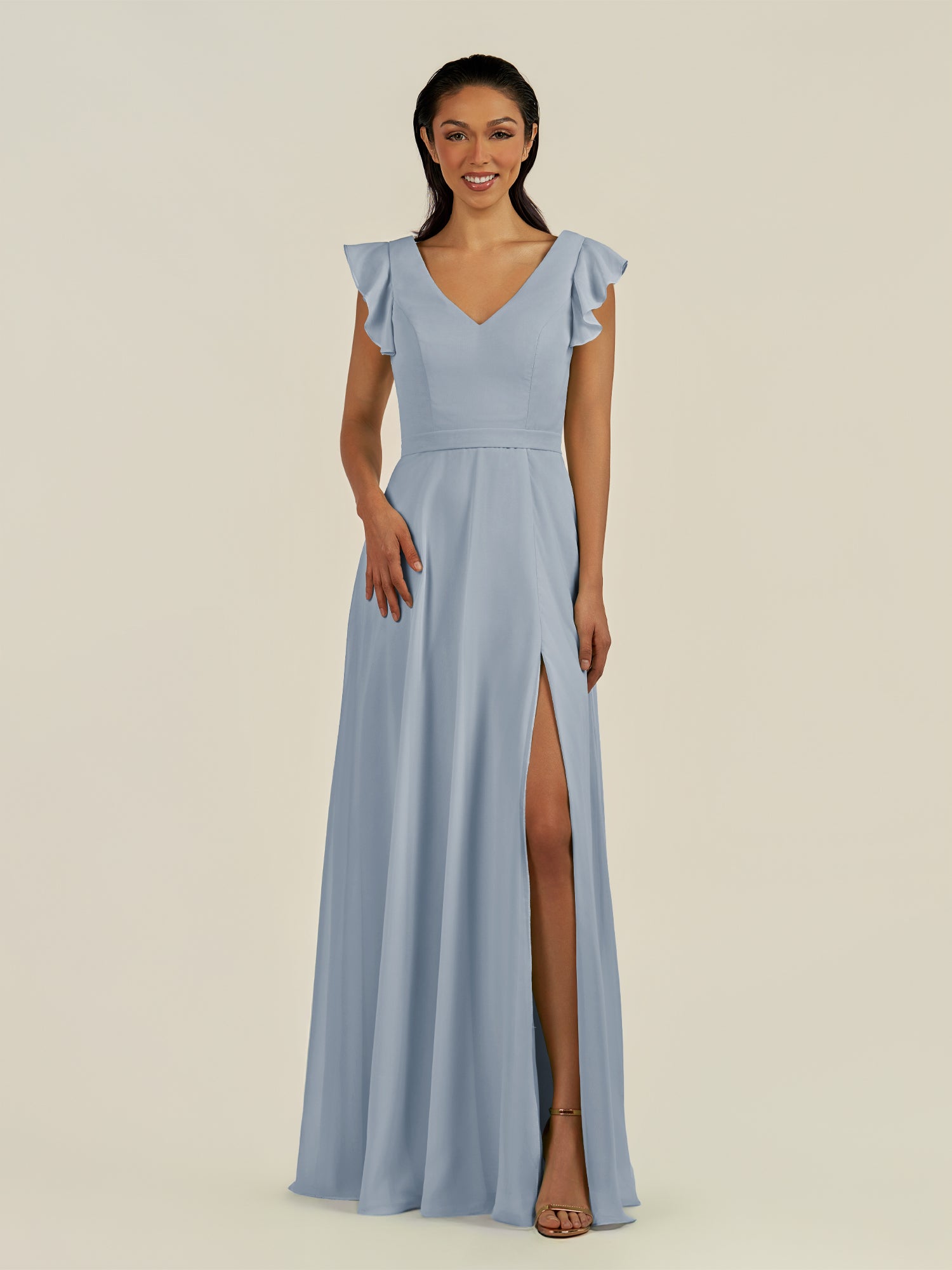 Orlina is a vision of delicate elegance and modern romance. Made from soft chiffon, she features a deep V-neckline and cap sleeves with flutter details that add a whimsical touch. Her floor-length A-line skirt flows gracefully, enhanced by side slit, while the tie-back closure provides a customizable, flattering fit. Orlina is perfect for bridesmaids seeking a light, airy, and sophisticated silhoue.