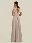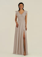 Orlina | Frost - A Line Chiffon V Neck Long Bridesmaid Dress with Flutter Sleeves