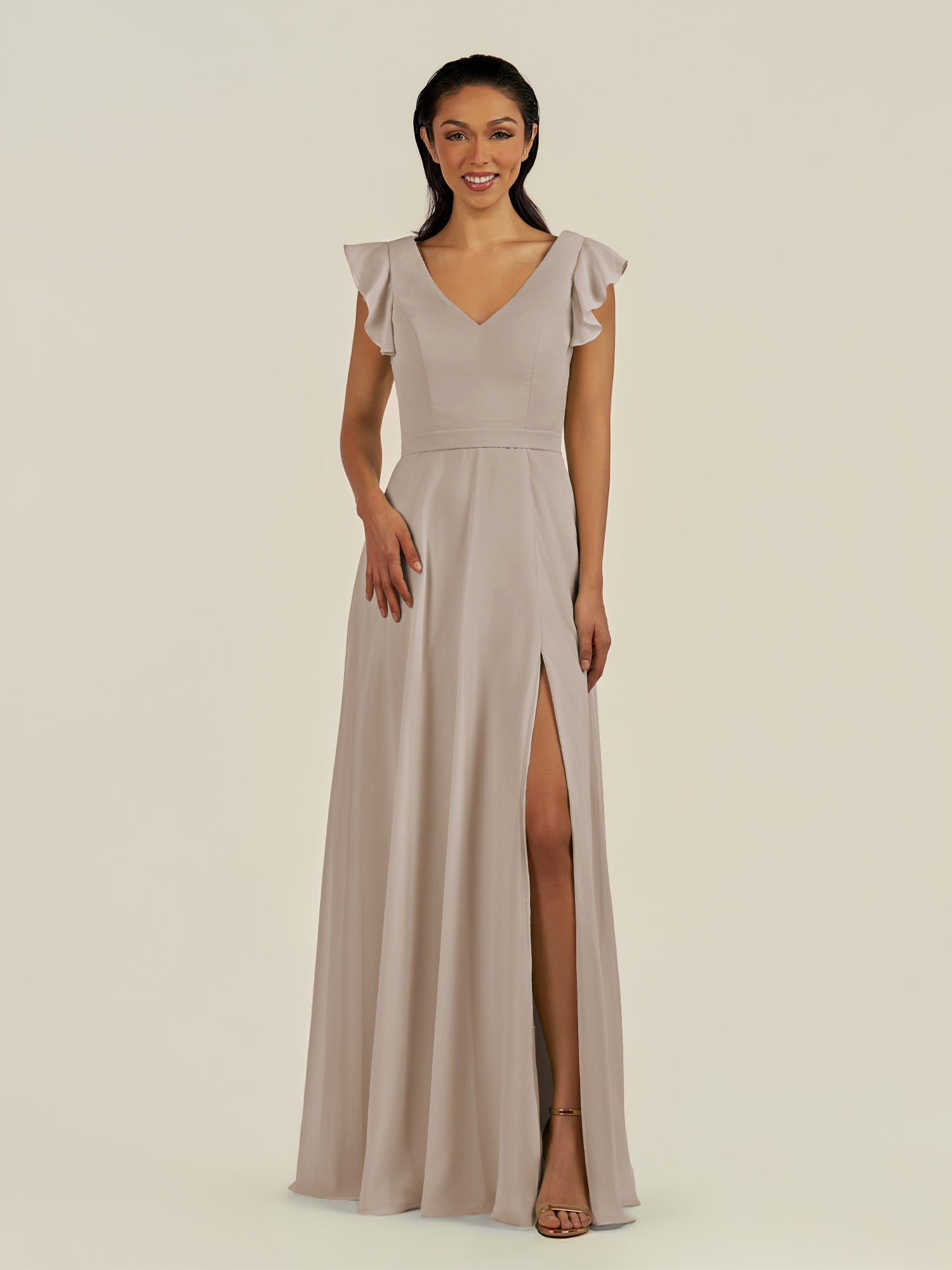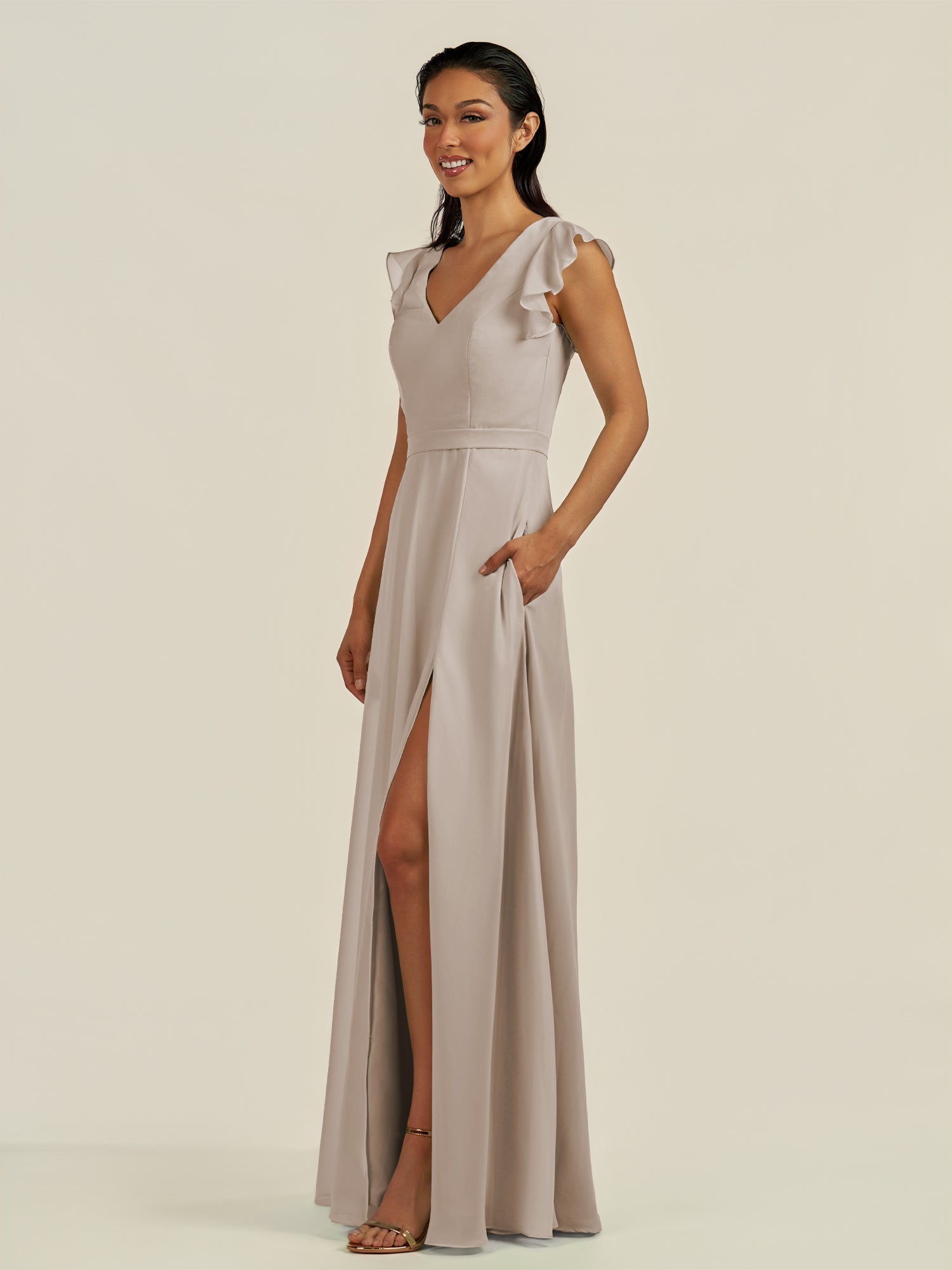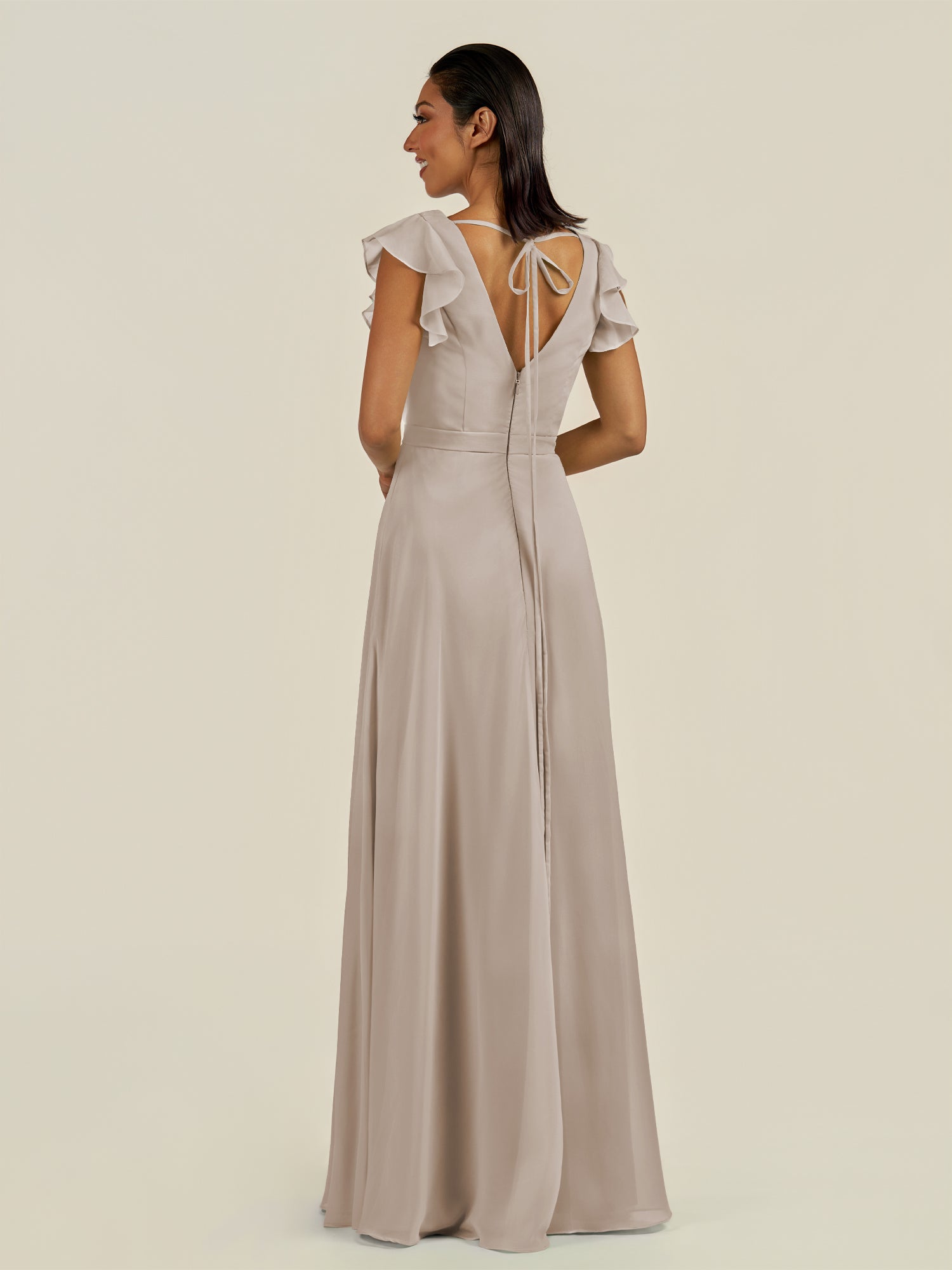 Orlina is a vision of delicate elegance and modern romance. Made from soft chiffon, she features a deep V-neckline and cap sleeves with flutter details that add a whimsical touch. Her floor-length A-line skirt flows gracefully, enhanced by side slit, while the tie-back closure provides a customizable, flattering fit. Orlina is perfect for bridesmaids seeking a light, airy, and sophisticated silhoue.
