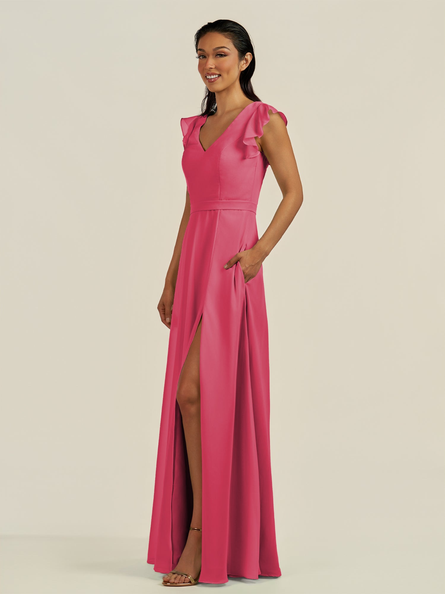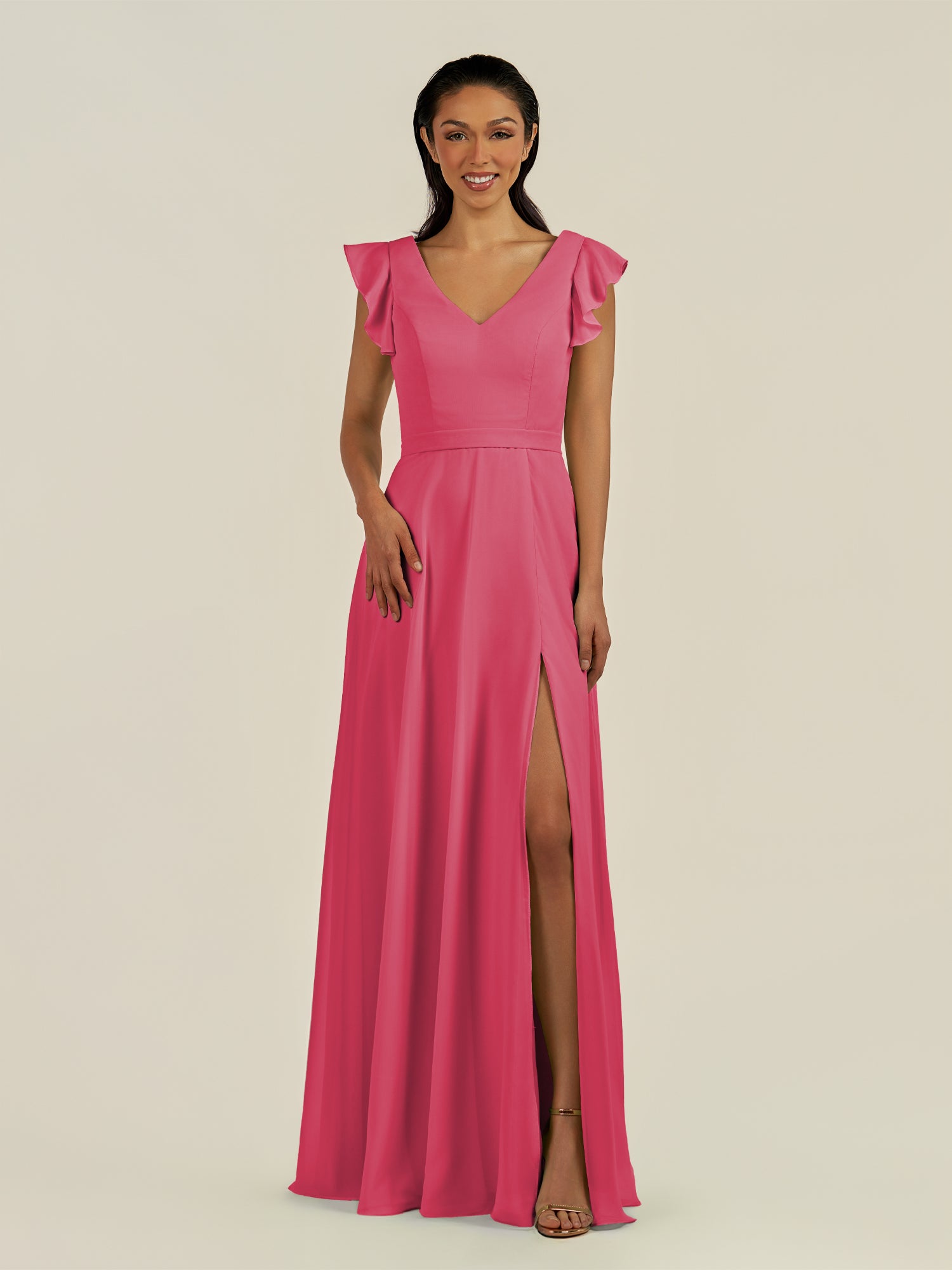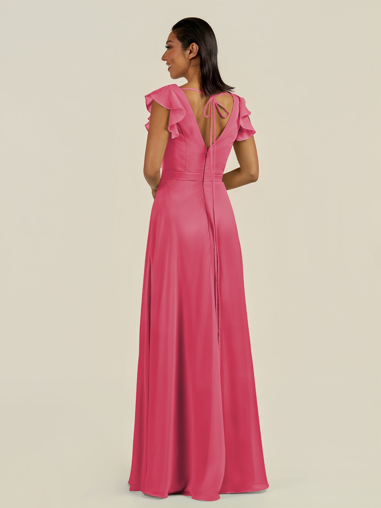 Orlina is a vision of delicate elegance and modern romance. Made from soft chiffon, she features a deep V-neckline and cap sleeves with flutter details that add a whimsical touch. Her floor-length A-line skirt flows gracefully, enhanced by side slit, while the tie-back closure provides a customizable, flattering fit. Orlina is perfect for bridesmaids seeking a light, airy, and sophisticated silhoue.