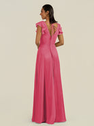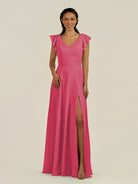 Orlina | Fuchsia - A Line Chiffon V Neck Long Bridesmaid Dress with Flutter Sleeves