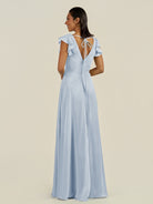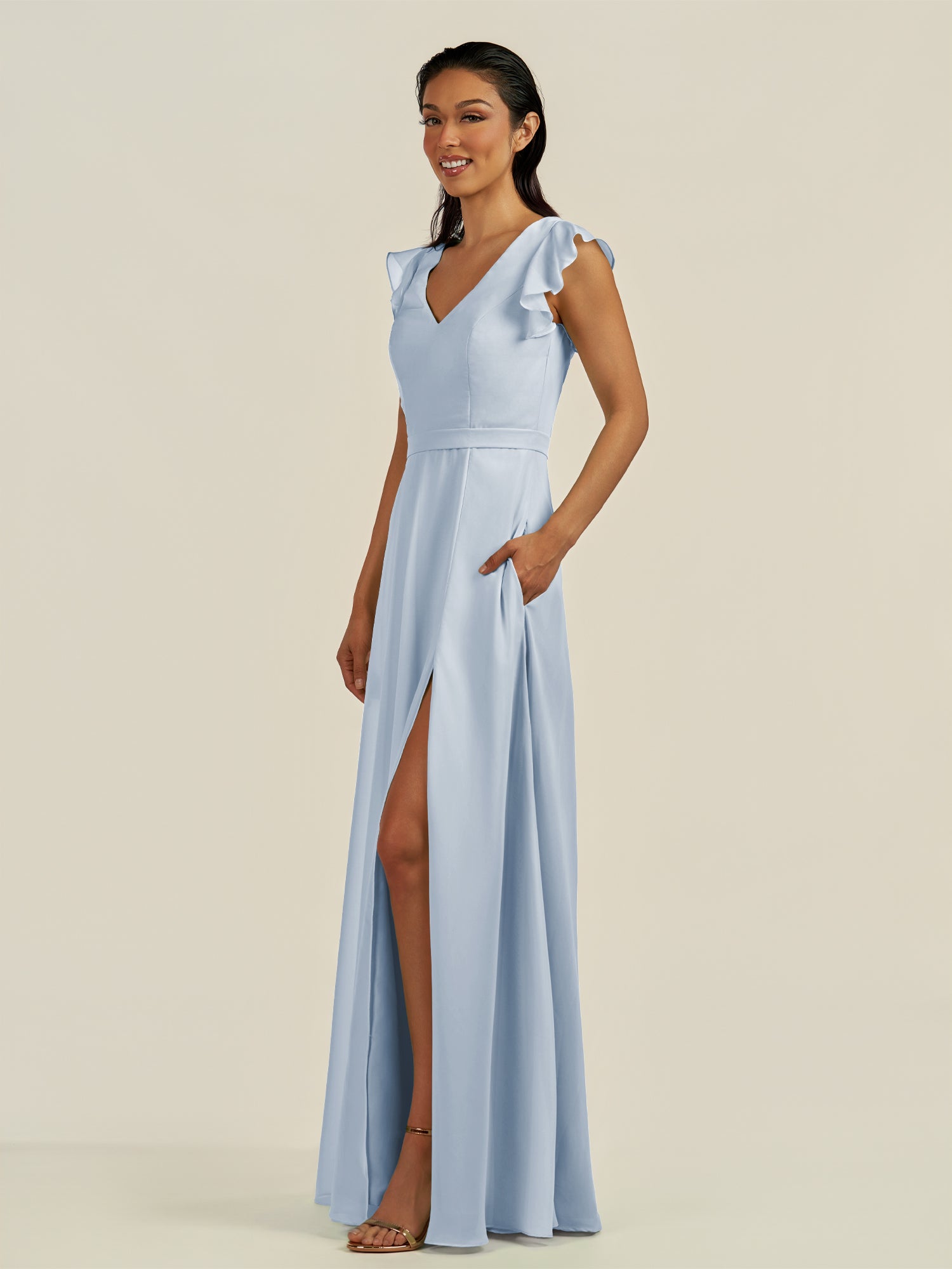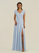 Orlina | Ice - A Line Chiffon V Neck Long Bridesmaid Dress with Flutter Sleeves