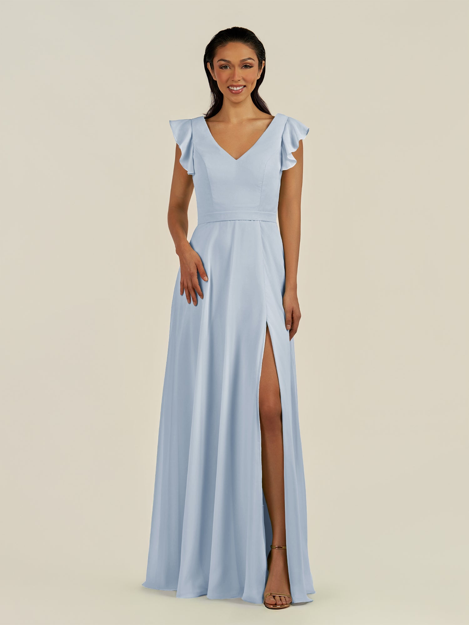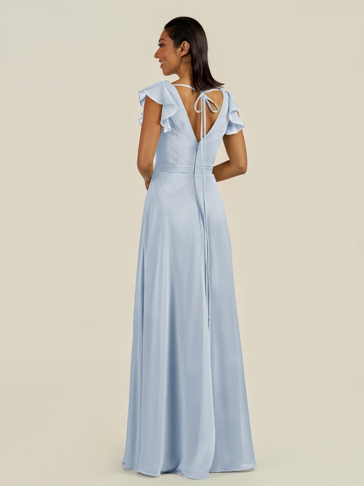 Orlina is a vision of delicate elegance and modern romance. Made from soft chiffon, she features a deep V-neckline and cap sleeves with flutter details that add a whimsical touch. Her floor-length A-line skirt flows gracefully, enhanced by side slit, while the tie-back closure provides a customizable, flattering fit. Orlina is perfect for bridesmaids seeking a light, airy, and sophisticated silhoue.