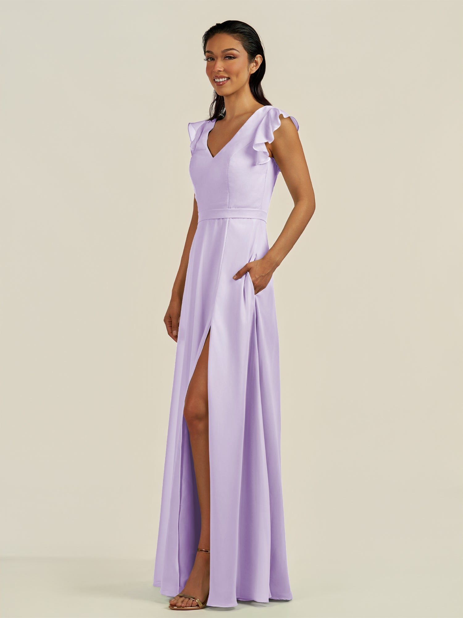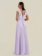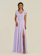 Orlina | Lavender - A Line Chiffon V Neck Long Bridesmaid Dress with Flutter Sleeves