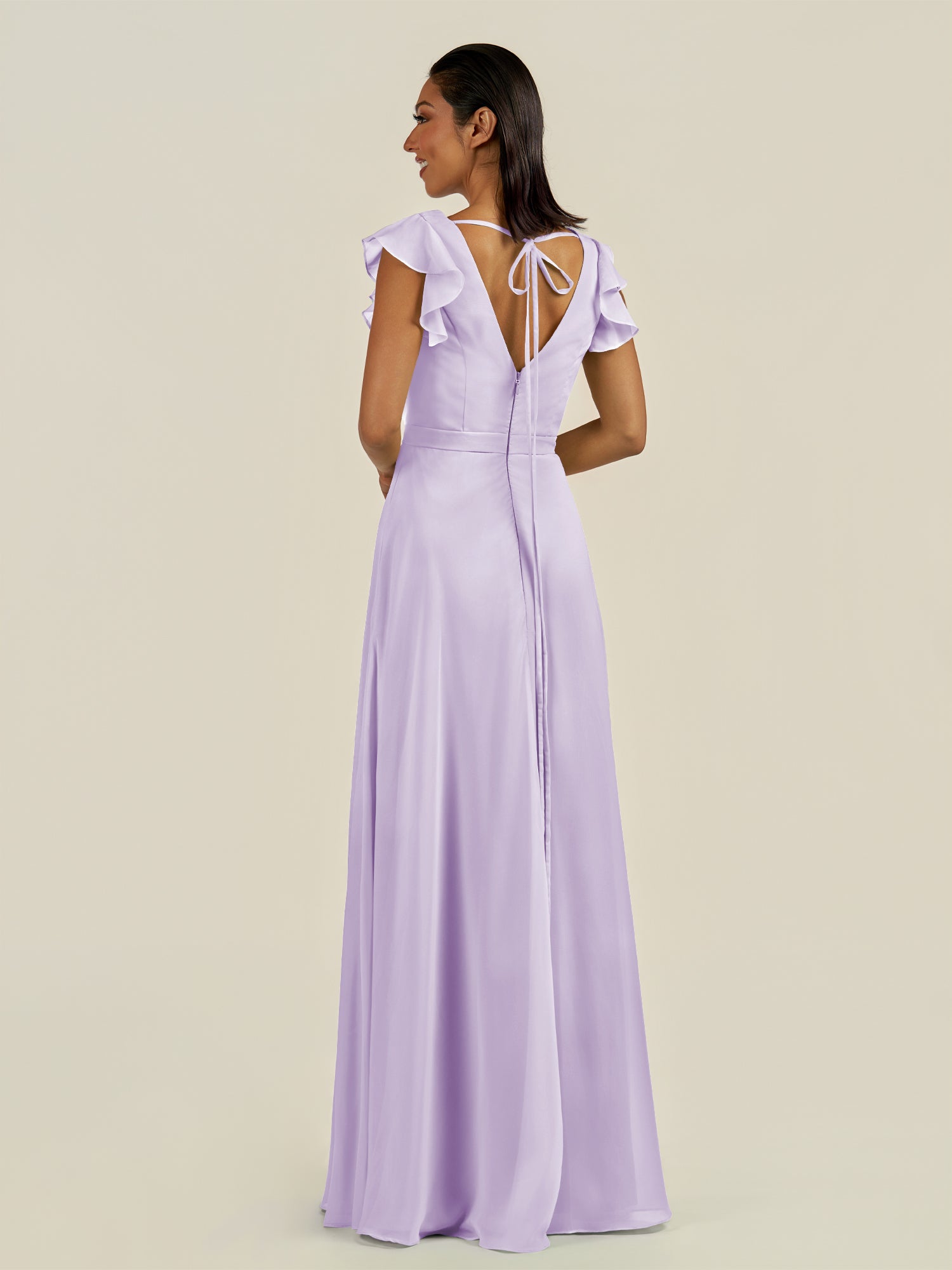 Orlina is a vision of delicate elegance and modern romance. Made from soft chiffon, she features a deep V-neckline and cap sleeves with flutter details that add a whimsical touch. Her floor-length A-line skirt flows gracefully, enhanced by side slit, while the tie-back closure provides a customizable, flattering fit. Orlina is perfect for bridesmaids seeking a light, airy, and sophisticated silhoue.
