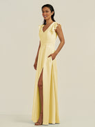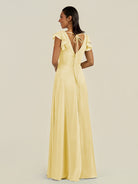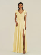 Orlina | Pastel Yellow - A Line Chiffon V Neck Long Bridesmaid Dress with Flutter Sleeves
