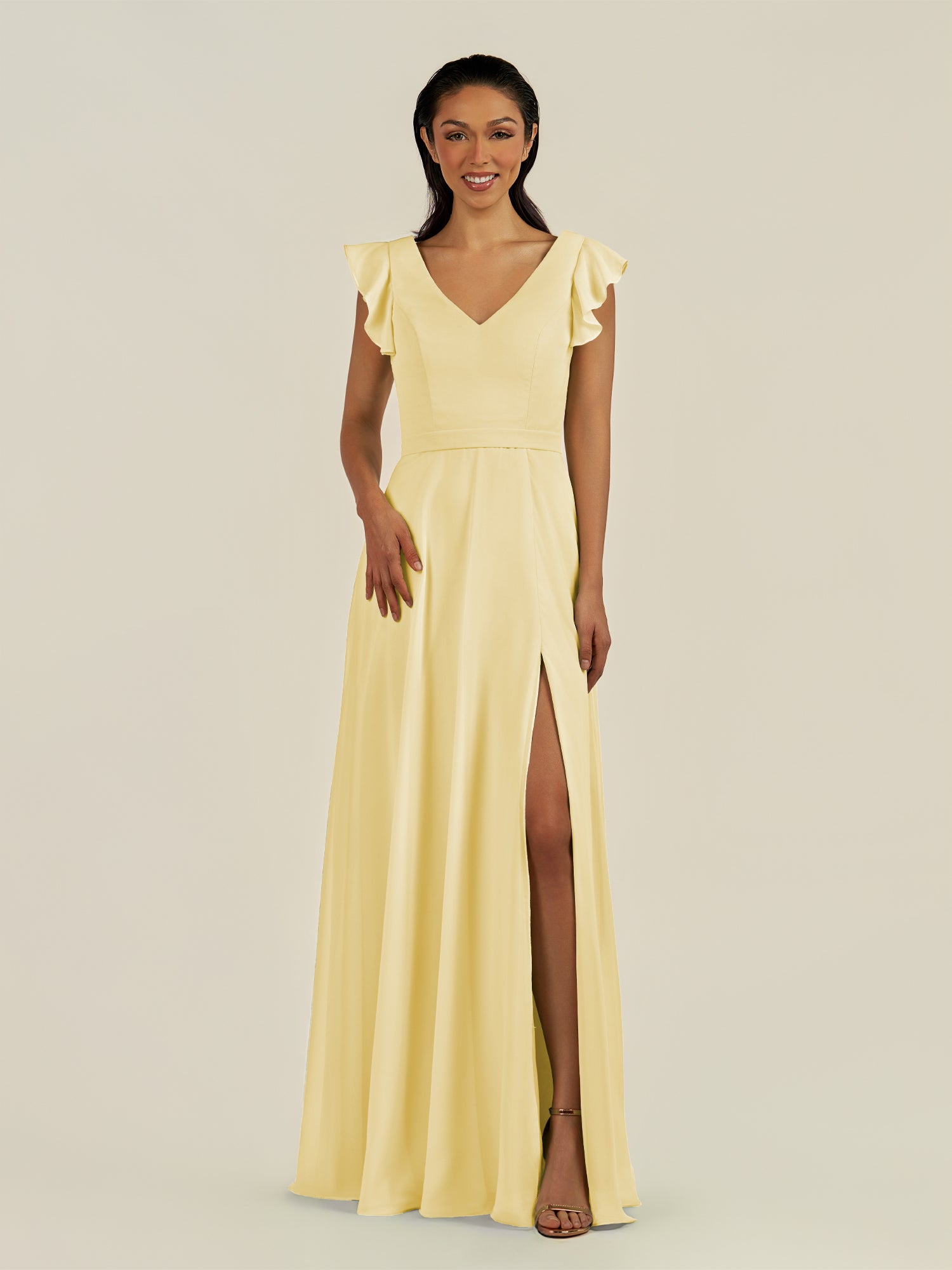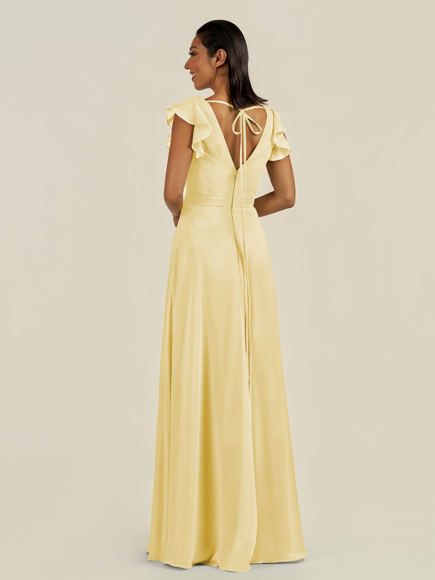 Orlina is a vision of delicate elegance and modern romance. Made from soft chiffon, she features a deep V-neckline and cap sleeves with flutter details that add a whimsical touch. Her floor-length A-line skirt flows gracefully, enhanced by side slit, while the tie-back closure provides a customizable, flattering fit. Orlina is perfect for bridesmaids seeking a light, airy, and sophisticated silhoue.