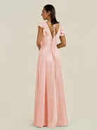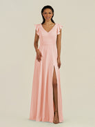 Orlina | Rose Petal - A Line Chiffon V Neck Long Bridesmaid Dress with Flutter Sleeves