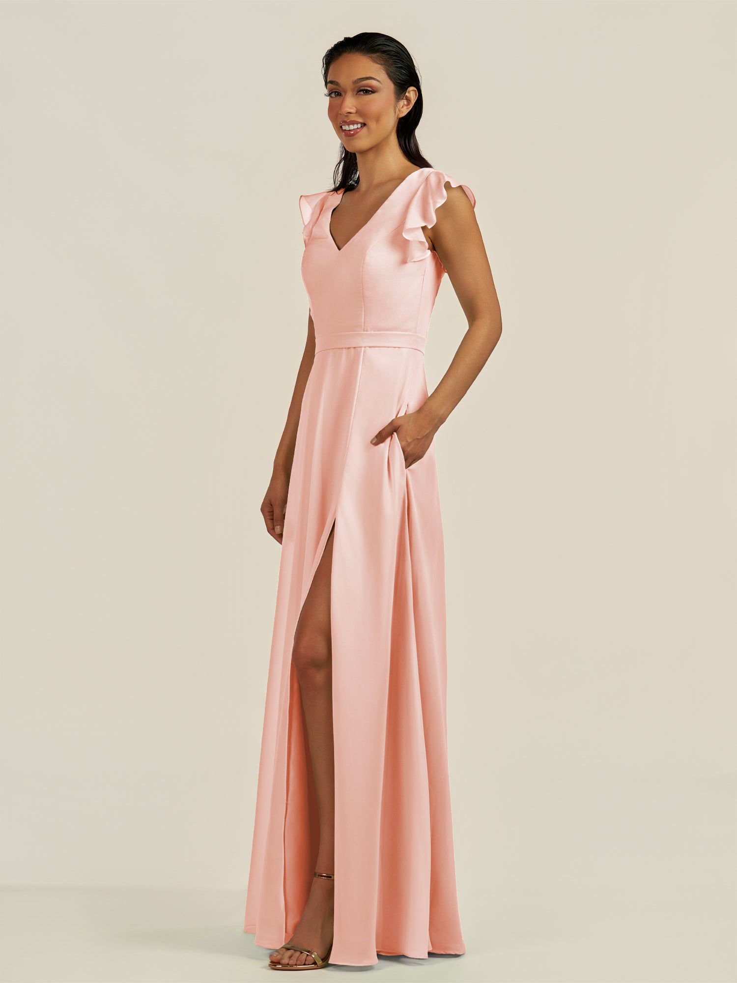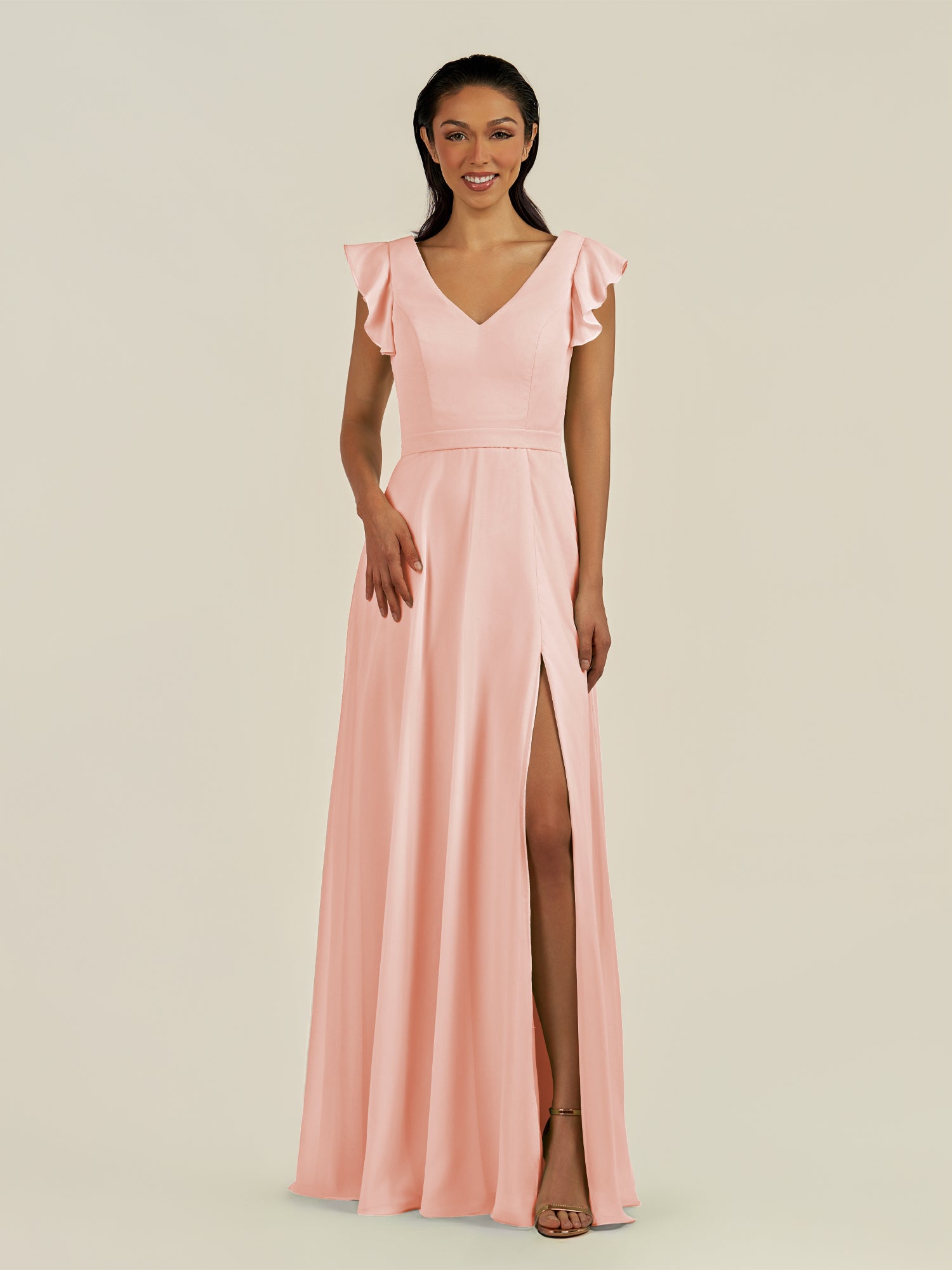 Orlina is a vision of delicate elegance and modern romance. Made from soft chiffon, she features a deep V-neckline and cap sleeves with flutter details that add a whimsical touch. Her floor-length A-line skirt flows gracefully, enhanced by side slit, while the tie-back closure provides a customizable, flattering fit. Orlina is perfect for bridesmaids seeking a light, airy, and sophisticated silhoue.