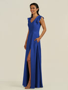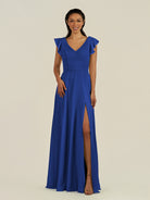 Orlina | Royal Blue - A Line Chiffon V Neck Long Bridesmaid Dress with Flutter Sleeves