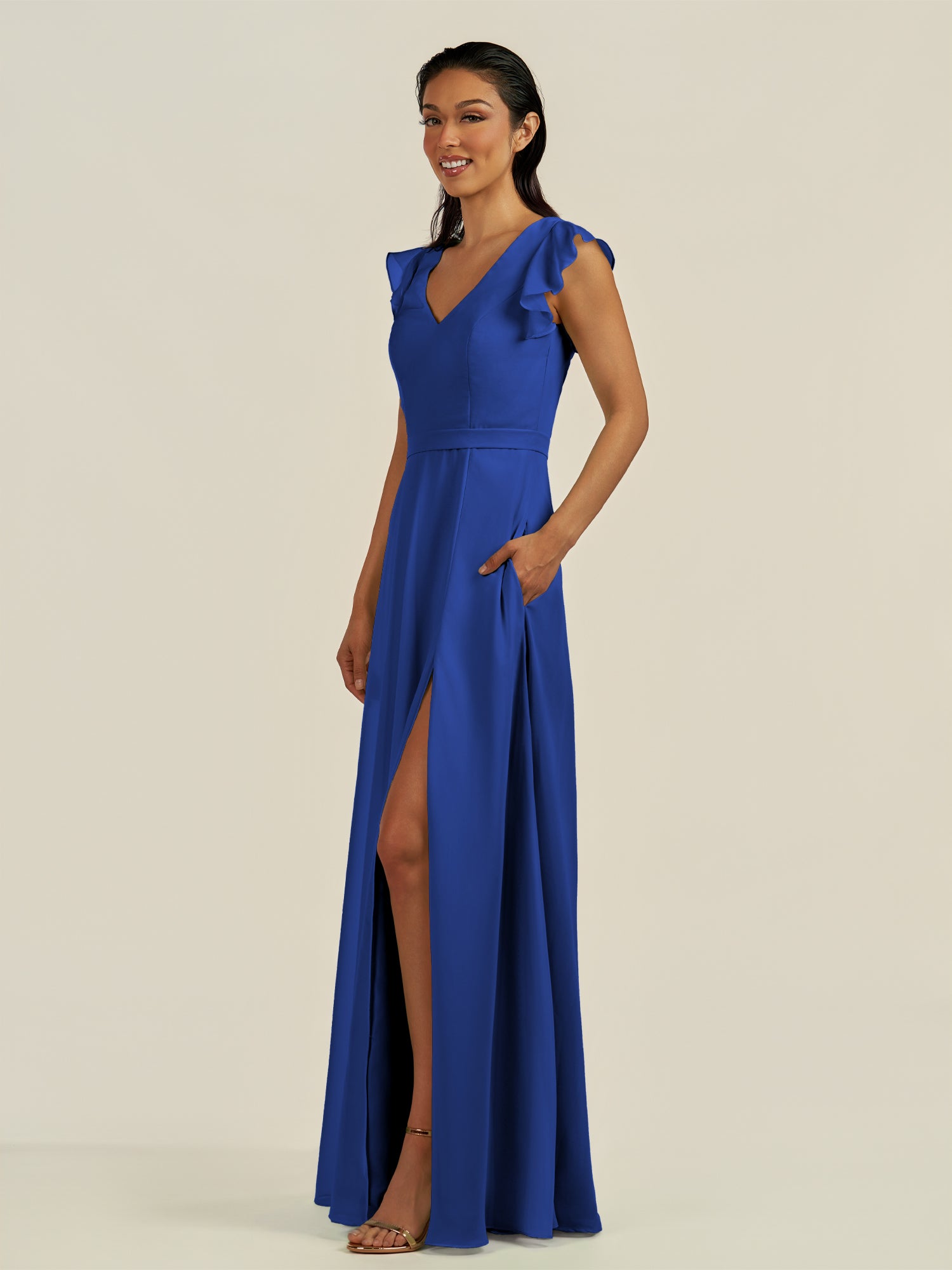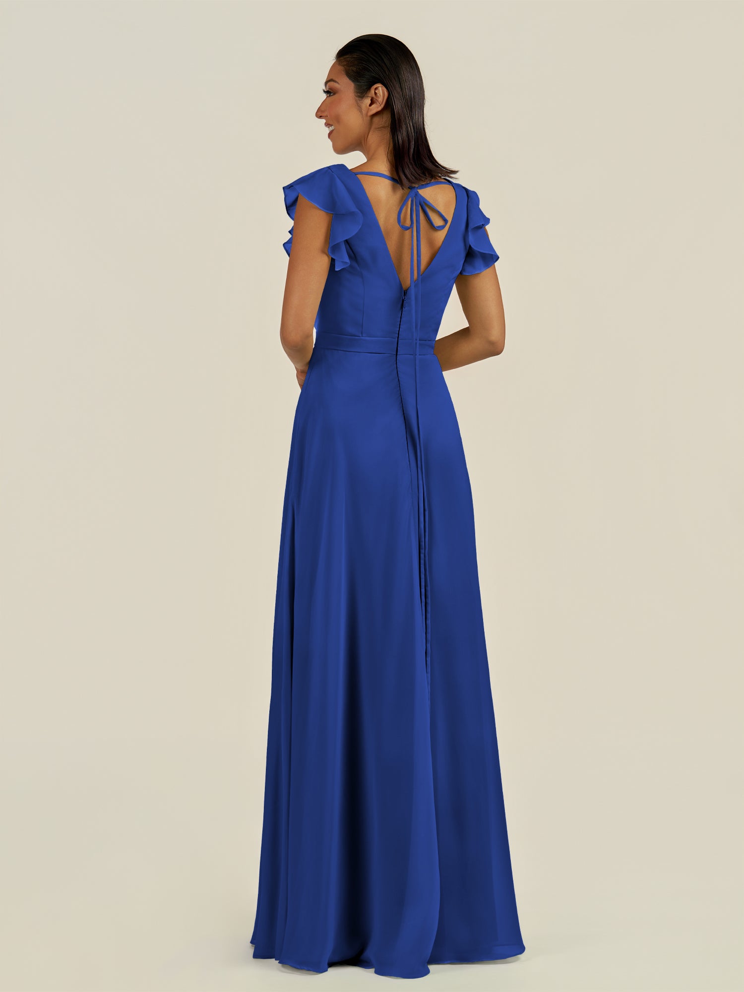 Orlina is a vision of delicate elegance and modern romance. Made from soft chiffon, she features a deep V-neckline and cap sleeves with flutter details that add a whimsical touch. Her floor-length A-line skirt flows gracefully, enhanced by side slit, while the tie-back closure provides a customizable, flattering fit. Orlina is perfect for bridesmaids seeking a light, airy, and sophisticated silhoue.