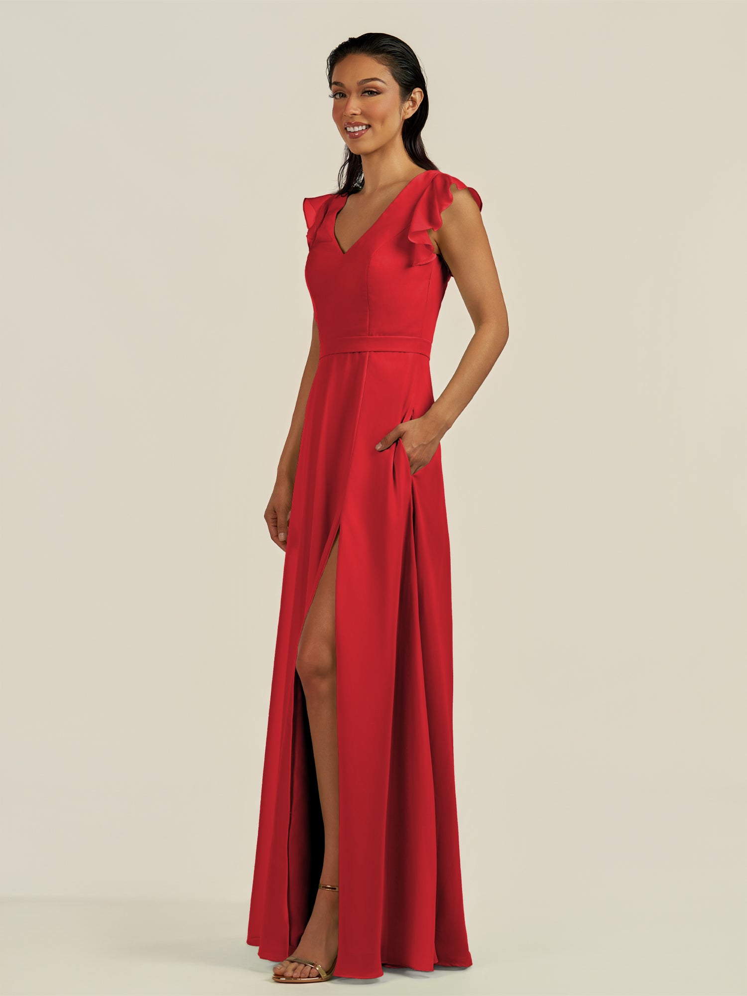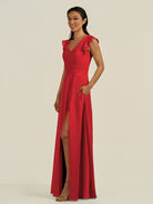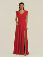 Orlina | Ruby Red - A Line Chiffon V Neck Long Bridesmaid Dress with Flutter Sleeves