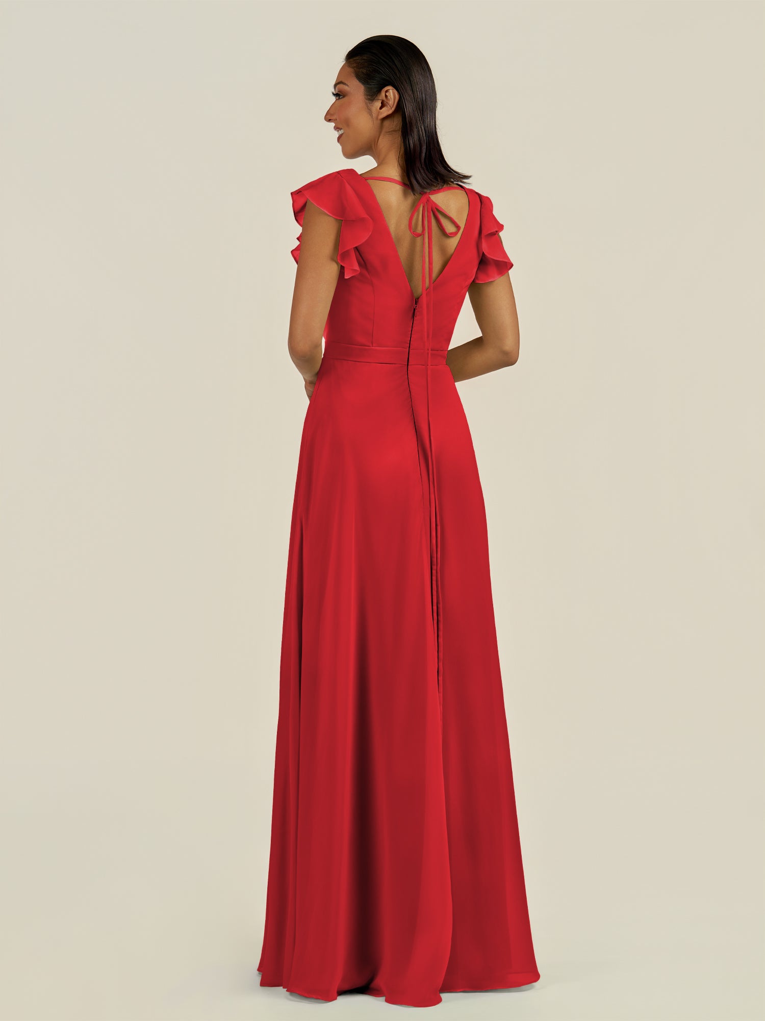 Orlina is a vision of delicate elegance and modern romance. Made from soft chiffon, she features a deep V-neckline and cap sleeves with flutter details that add a whimsical touch. Her floor-length A-line skirt flows gracefully, enhanced by side slit, while the tie-back closure provides a customizable, flattering fit. Orlina is perfect for bridesmaids seeking a light, airy, and sophisticated silhoue.