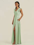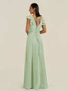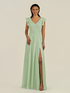 Orlina | Sage - A Line Chiffon V Neck Long Bridesmaid Dress with Flutter Sleeves
