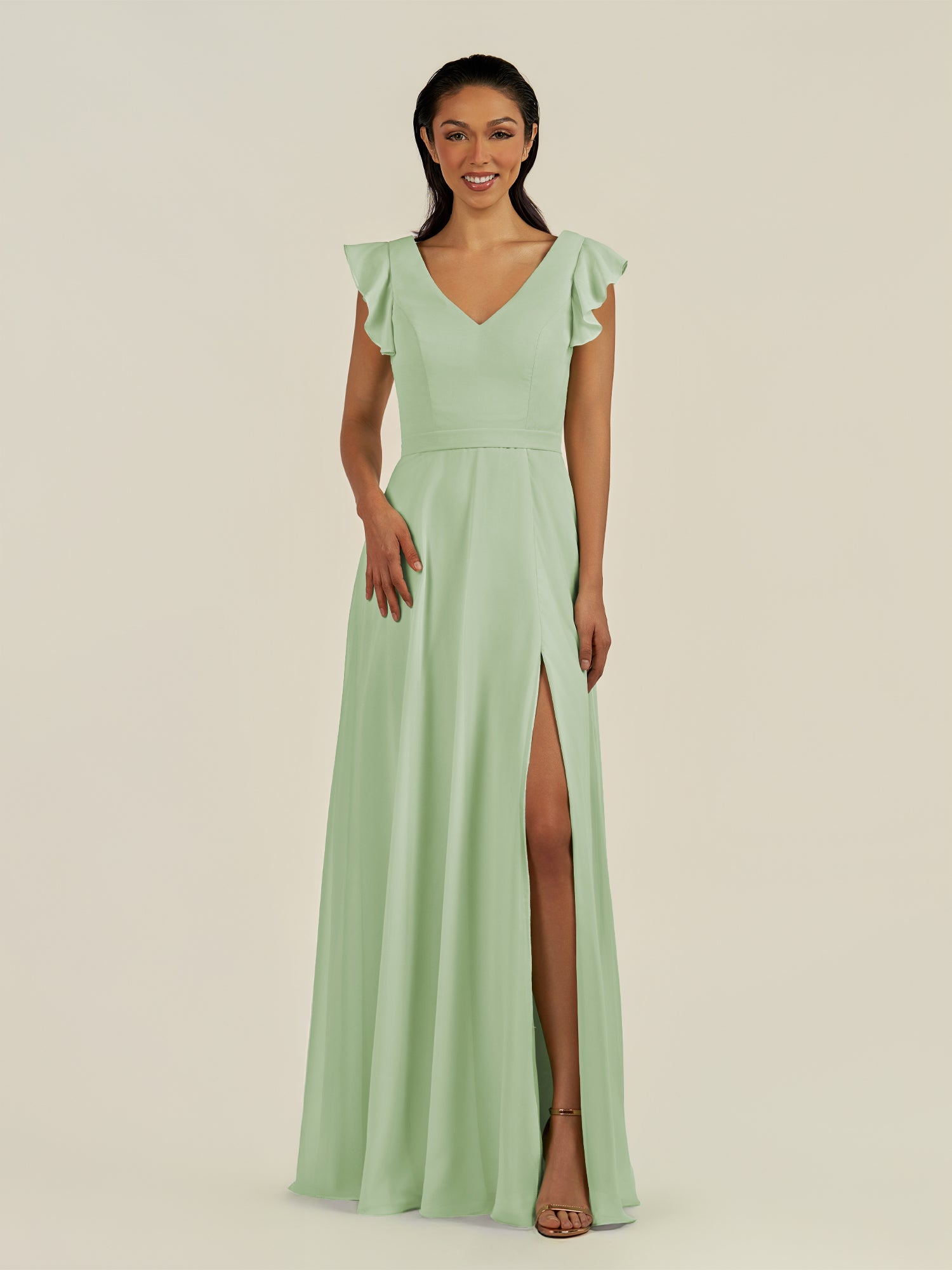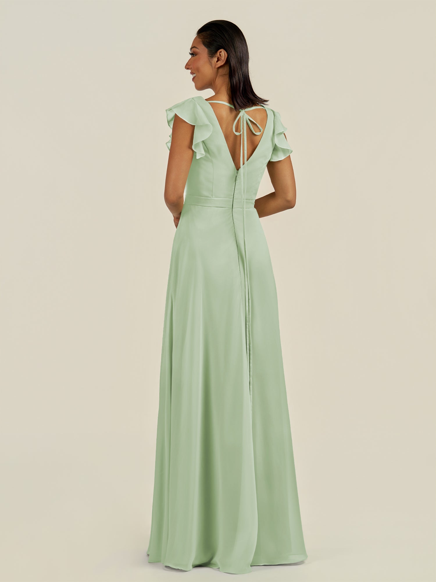 Orlina is a vision of delicate elegance and modern romance. Made from soft chiffon, she features a deep V-neckline and cap sleeves with flutter details that add a whimsical touch. Her floor-length A-line skirt flows gracefully, enhanced by side slit, while the tie-back closure provides a customizable, flattering fit. Orlina is perfect for bridesmaids seeking a light, airy, and sophisticated silhoue.