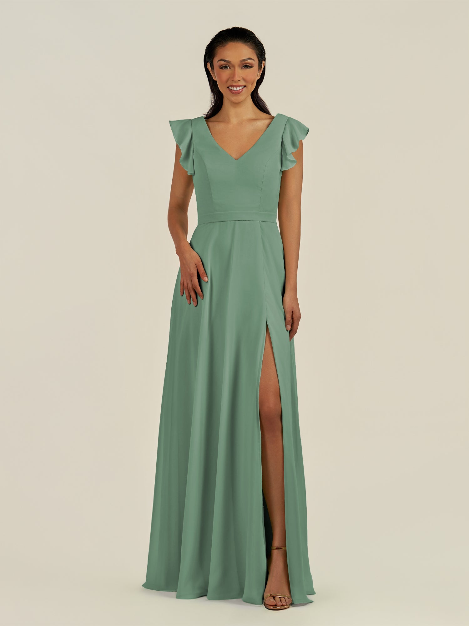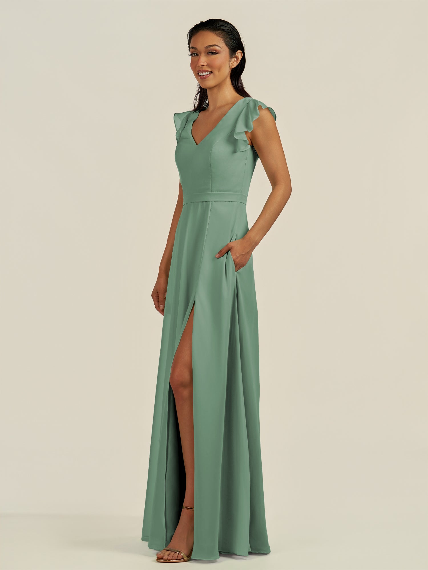Orlina | Sea Glass - A Line Chiffon V Neck Long Bridesmaid Dress with Flutter Sleeves