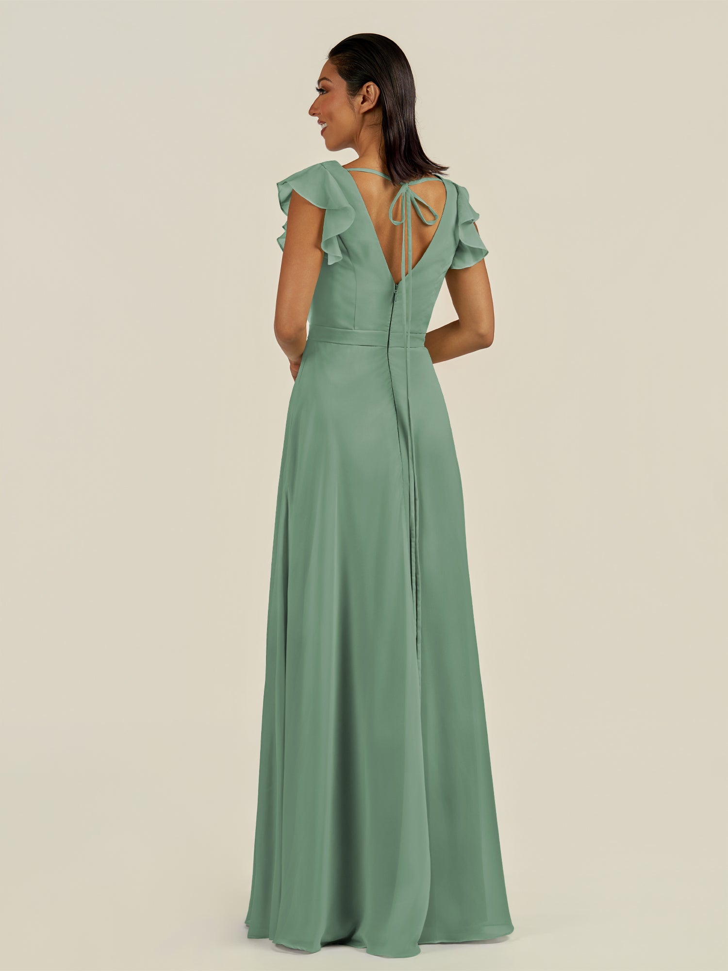 Orlina is a vision of delicate elegance and modern romance. Made from soft chiffon, she features a deep V-neckline and cap sleeves with flutter details that add a whimsical touch. Her floor-length A-line skirt flows gracefully, enhanced by side slit, while the tie-back closure provides a customizable, flattering fit. Orlina is perfect for bridesmaids seeking a light, airy, and sophisticated silhoue.