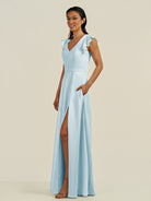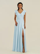 Orlina | Sky Blue - A Line Chiffon V Neck Long Bridesmaid Dress with Flutter Sleeves