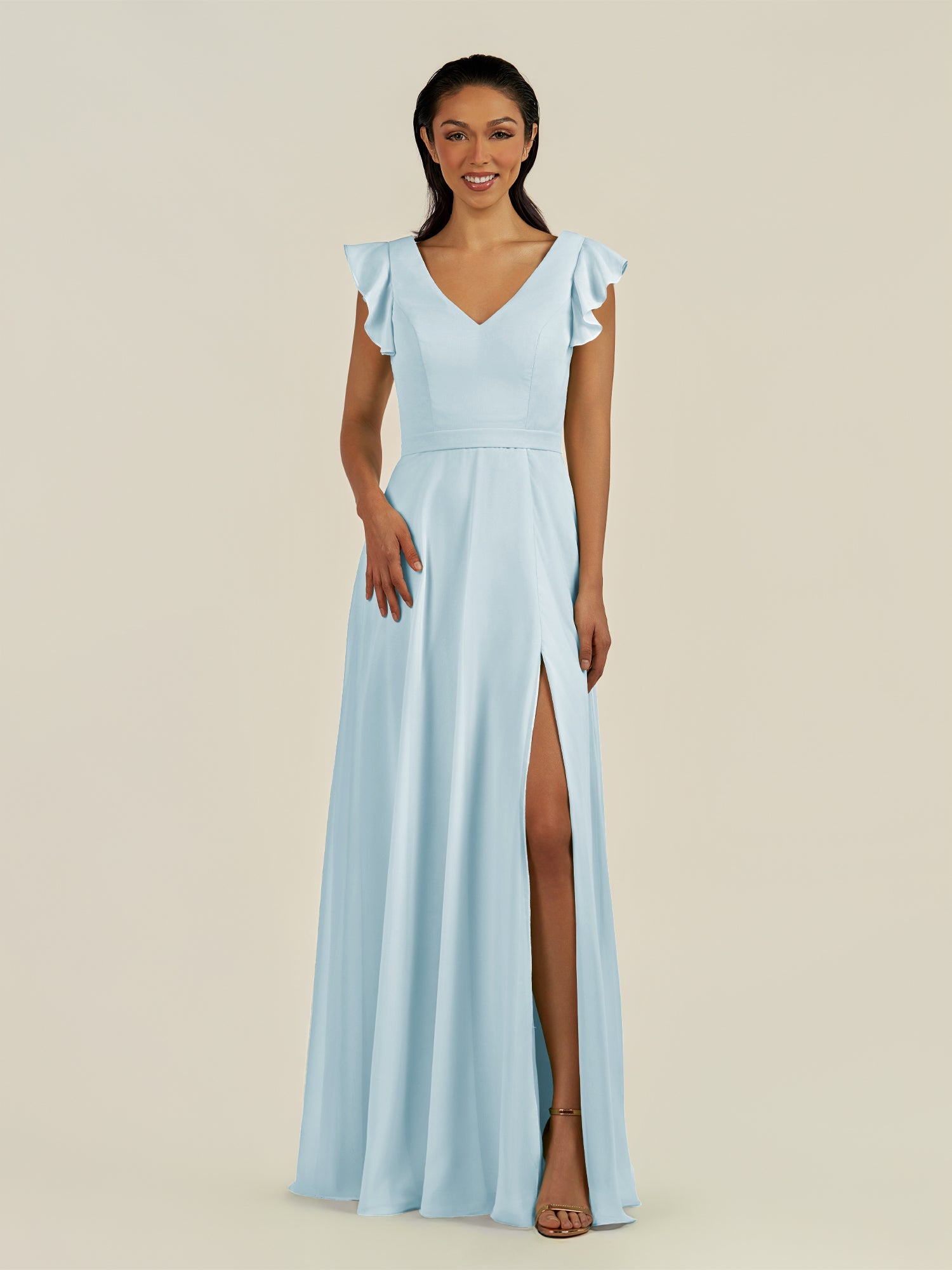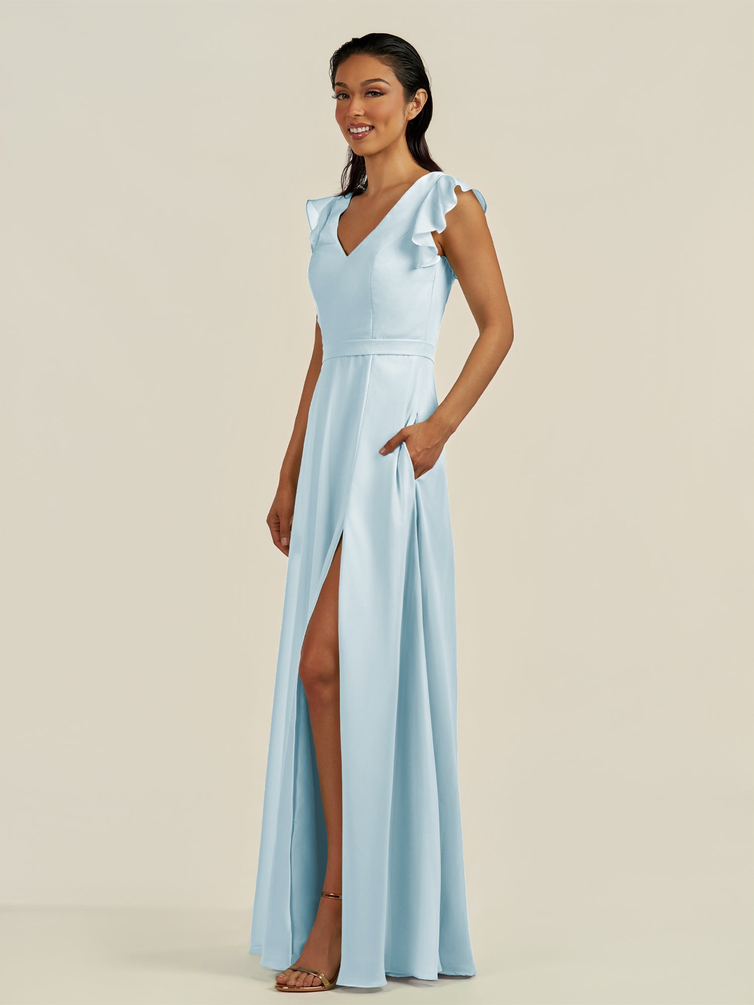 Orlina is a vision of delicate elegance and modern romance. Made from soft chiffon, she features a deep V-neckline and cap sleeves with flutter details that add a whimsical touch. Her floor-length A-line skirt flows gracefully, enhanced by side slit, while the tie-back closure provides a customizable, flattering fit. Orlina is perfect for bridesmaids seeking a light, airy, and sophisticated silhoue.